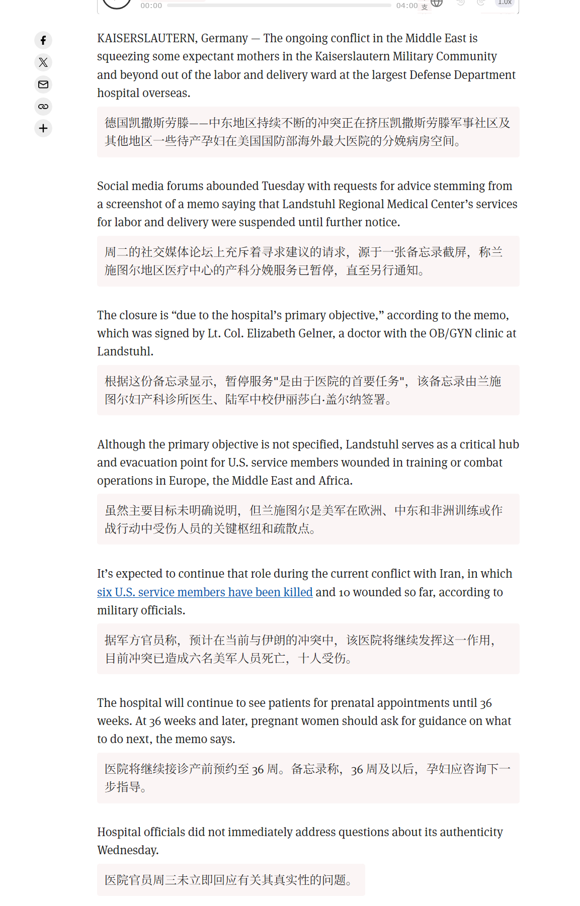 🔻而且,前几天,美军驻德国的兰施图尔地区医疗中心的产科分娩服务已暂停,直至另行通知。🔻根据备忘录显示,暂停服务"是由于医院的首要任务",该备忘录由兰施图尔妇产科诊所医生、陆军中校伊丽莎白·盖尔纳签署。🔻然主要目标未明确说明,但兰施图尔是美军在欧洲、中东和非洲训练或作战行动中受伤人员的关键枢纽和疏散点。🔻死6个人,至于吗?🔻via stripes 新闻伊朗总统称不再首先攻击邻国伊朗不许美以相关船只通过霍尔木兹海外新鲜事中东现场直击