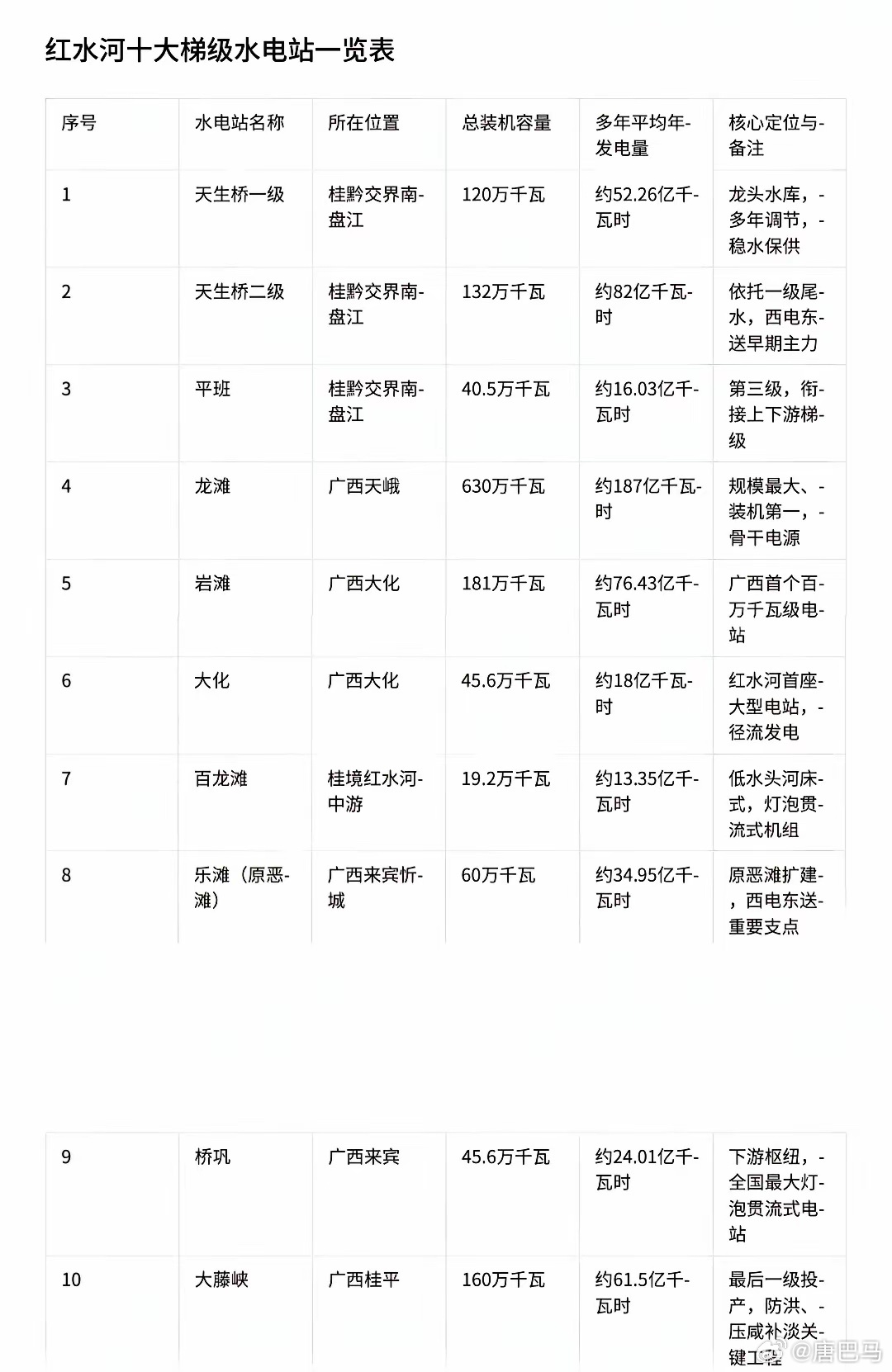 广西的水电主要布局在红水河,建有十座梯级水电站,总装机约1360万千瓦,多年平均发电量约560亿千瓦时,是广西清洁电力基石。上游天生桥和龙滩为调节水库,是保障全梯级稳定出力的压舱石,下游大藤峡兼顾防洪、航运、压咸,综合效益显著。另外还有其它河流的水电站,都各自发挥相当大的作用。 值得一提的是装机120万千瓦的南宁抽水蓄能电站,已经在2025年底投产发电,提供240万千瓦调节能力,每年消纳绿电约25亿千瓦时,是时髦的“超级充电宝”。
