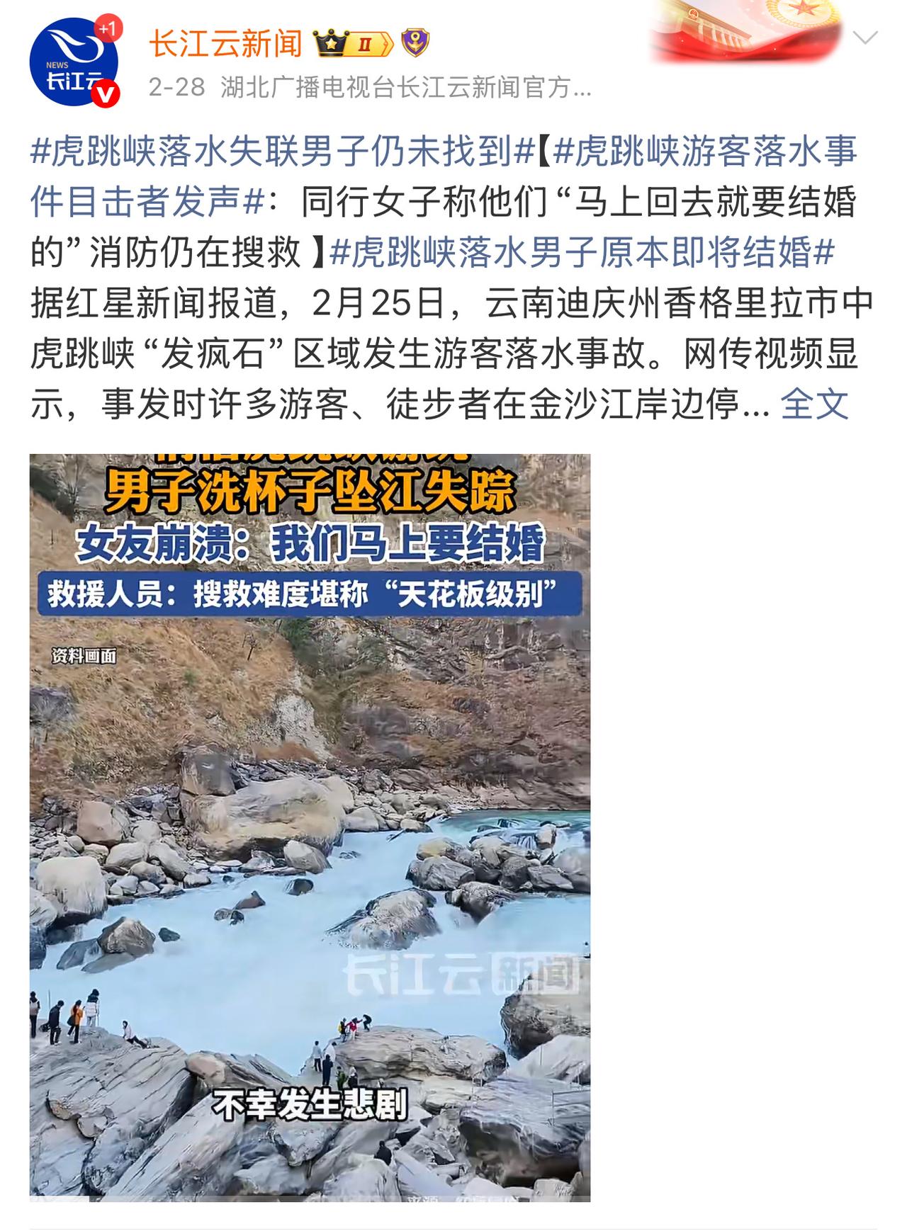 搜救了整整9天,在虎跳峡洗水杯的新郎确认离世,本以为他是被急流冲走的,没想到是人被卡在了落水处不远的石头缝里。 据了解,落水区域水深五米,每秒钟的水流能涨到6到8米,合理猜疑新郎在被冲走那一瞬间就直接失去意识了。 令人疑惑的是,新郎到底是出于什么心理在这里洗杯子,要知道这里的水很浑浊,不理解啊不理解。
