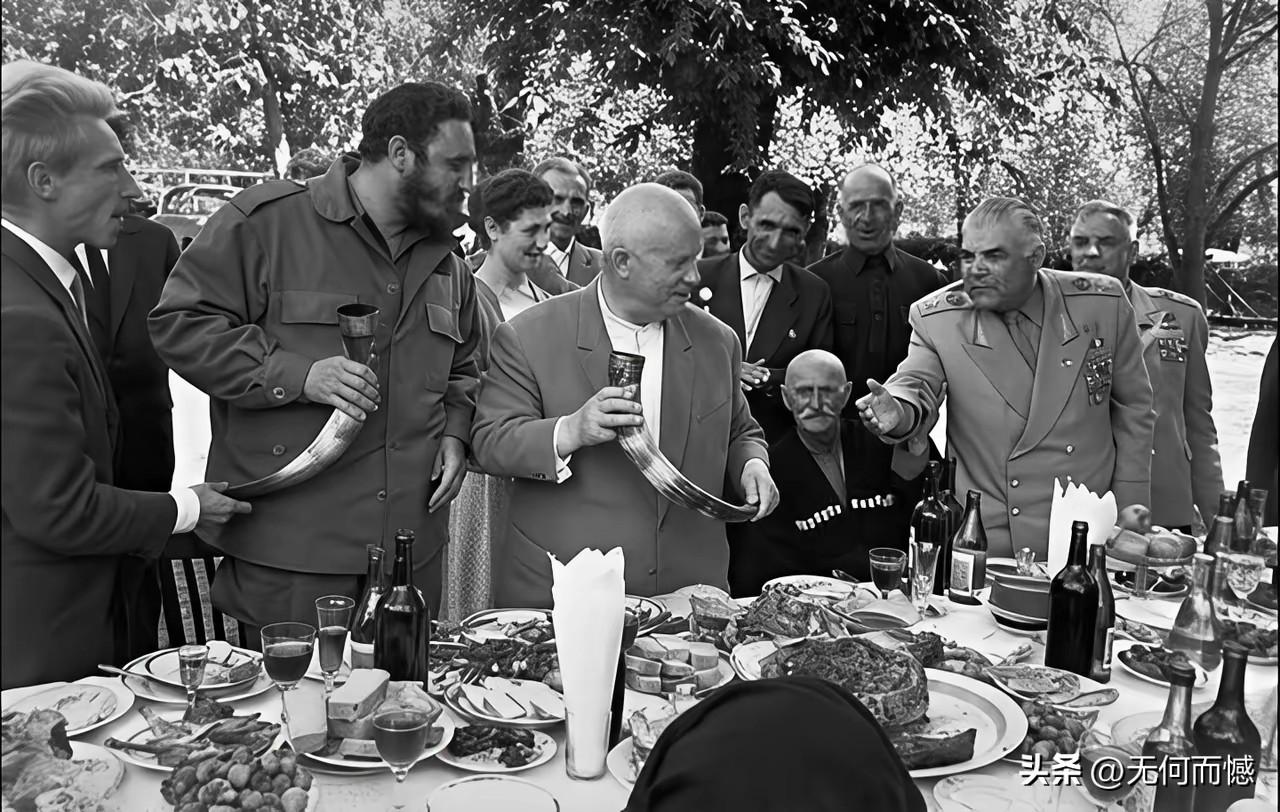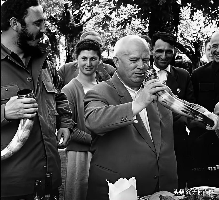 赫鲁晓夫和卡斯特罗用牛角杯喝酒的画面,看起来特别的有意思,发现用这种酒杯喝酒的时候,酒杯是放不下的,只能用一直用手拿着,吃菜的时候可怎么办呢?这种酒杯如果装满酒的话,估计情况能装1斤酒,酒量不大的话,根本就不敢拿这种杯干杯,看来他们两个人的量都很大,喝的很尽兴,喝的很开心,弹指一挥间,这都已经是60多年前的画面了!