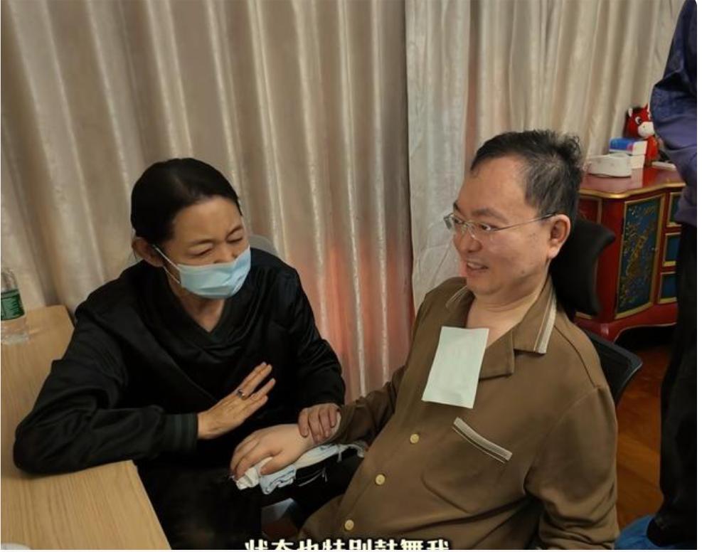 3月6日,倪萍去探望蔡磊,打开门是蔡磊妻子,进家门就寒暄几句,就迫不及待,去卧室探望蔡磊,看到蔡磊坐在电脑旁边,倪萍看到蔡磊,满眼都是心疼,眼框泪在打转,可她忍住,征求家属后,轻轻拥抱了蔡磊,蔡磊虽然不能用言语表达,在内心也是非常激动。 看到这种病人,感到很心疼,现在科学这么发达,为什么就没有药治呢!