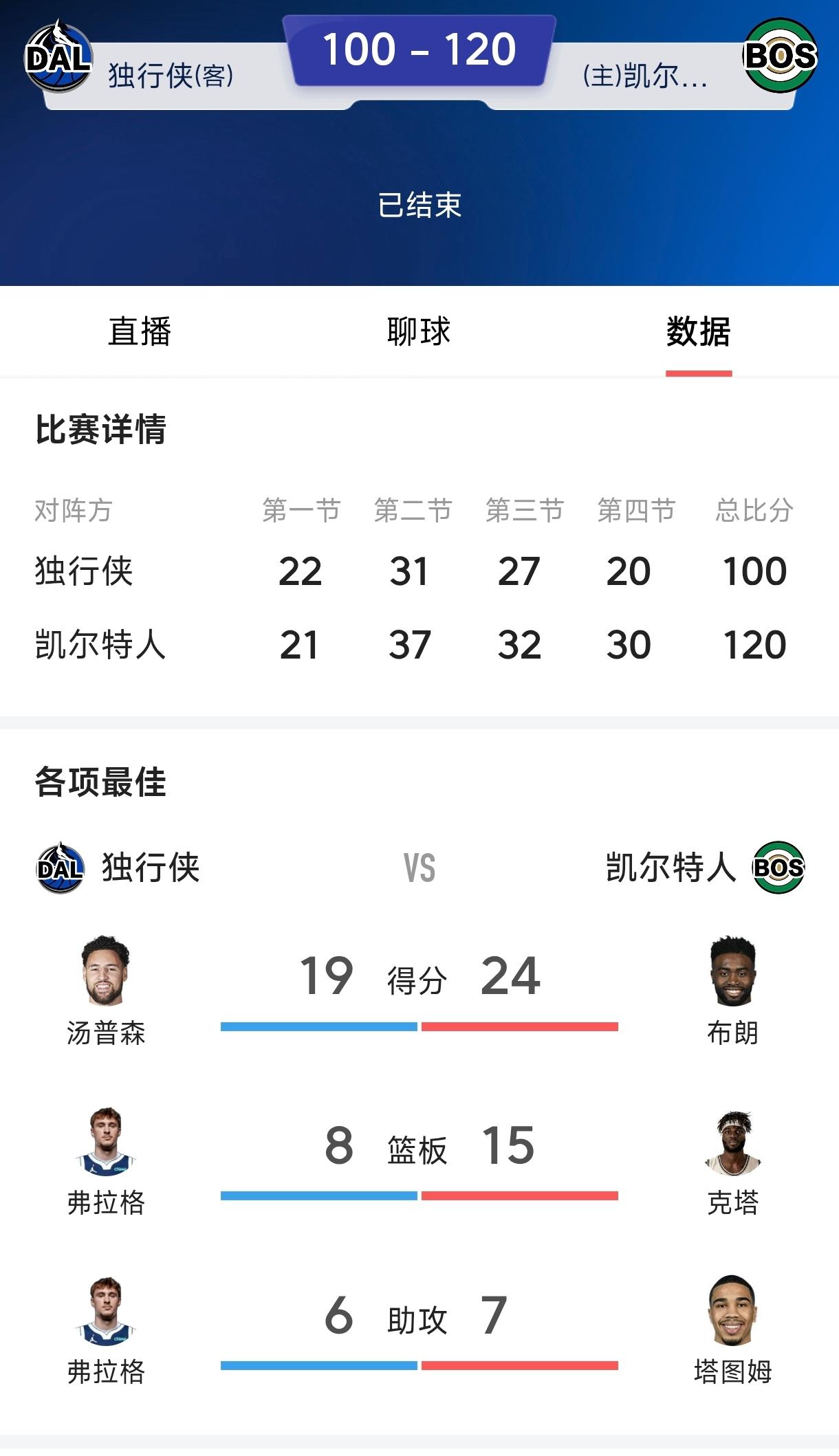 一个普理查德都能打的小里弗斯满地找牙, 塔图姆复出状态爆棚攻防一体, 带领凯尔特人大胜弗拉格的独行侠。 一觉醒来凯尔特人又要争冠了, 塔图姆复出还是攻防一体全明星, 湖人球迷又要伤心加难过了。 去年塔图姆跟腱断裂后, 球队立即选择重建送出重要轮换球员, 但保留了核心布朗和怀特, 加上独特的选人眼光, 先进的培养体系培养出了普理查德, 凯尔特人培养的球员都是攻防一体, 反观湖人把小里弗斯这种攻强守弱的当宝, 把数据刷子基本没防守的东契奇当建队基石, 两队的管理水平根本就不在一个档次。