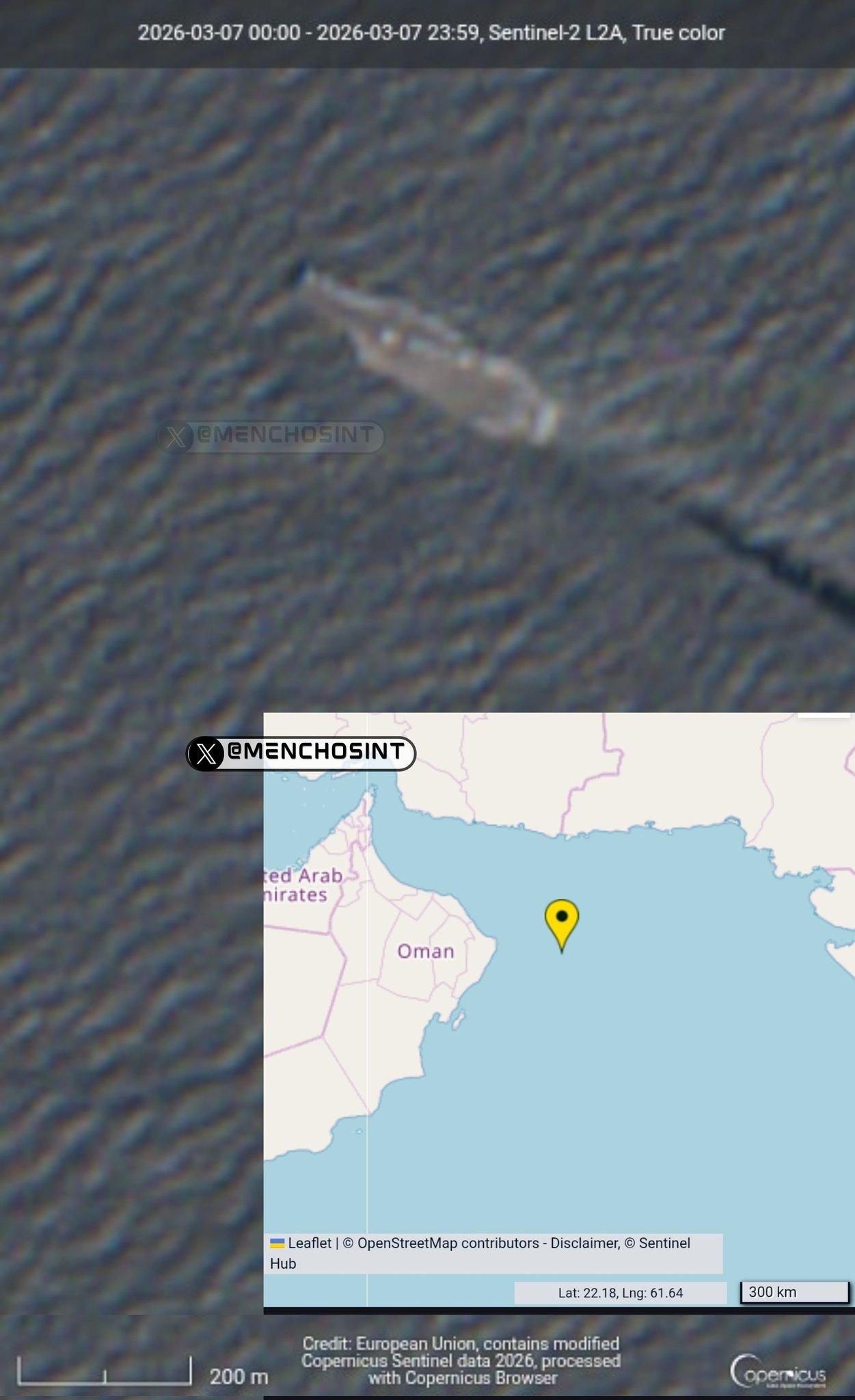 根据 Sentinel-2 卫星 3 月 7 日 06:27 UTC(仅 5 小时前)拍摄的图像,确定了美国海军“亚伯拉罕·林肯”号航空母舰 (CVN-72) 的位置。 该航母距离伊朗海岸350公里,并且正在靠近。