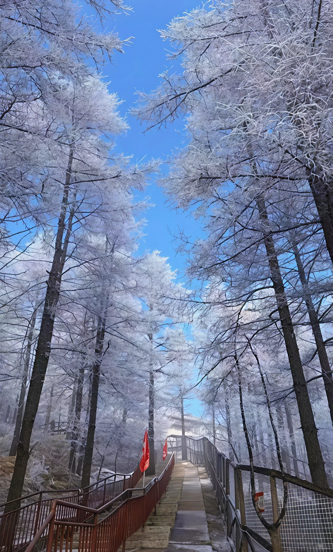 - 雾凇森林:银枝玉叶在蓝天映衬下bling bling✨,手机随手拍都是壁纸级大片📸