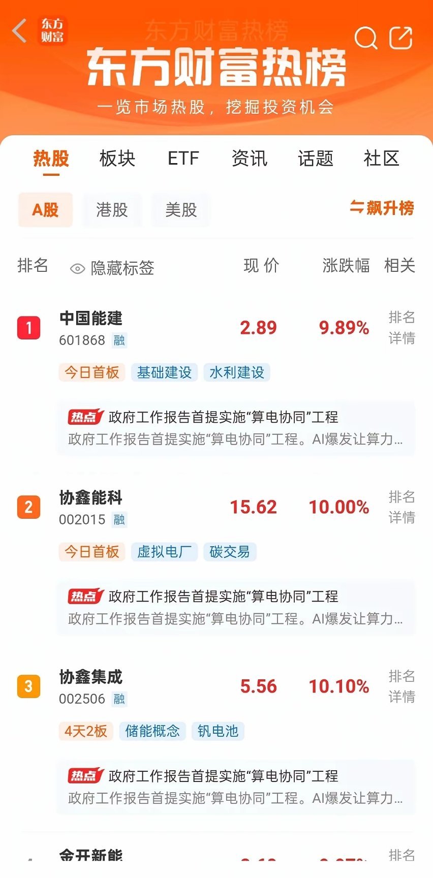 今晚东方财富网人气榜主要集中在这三个板块:第一个板块是,算电协同,智能电网板块,