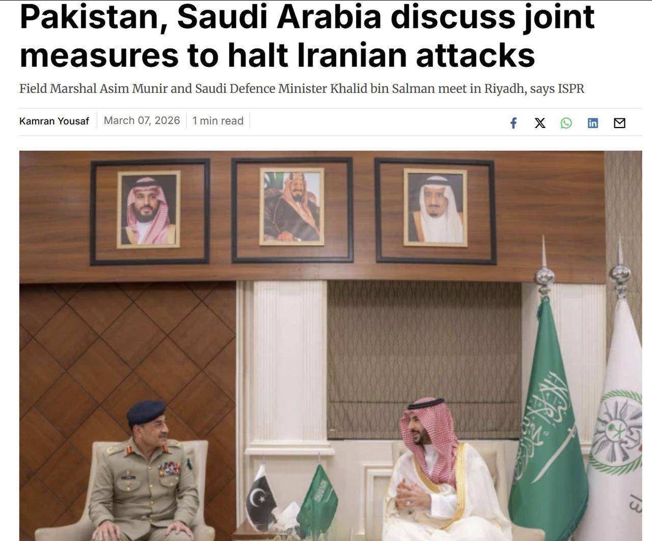 巴基斯坦军方领导人令赛义德·阿西姆·穆尼尔元帅今天前往利雅得与沙特阿拉伯国防大臣哈立德·本·萨勒曼会面,讨论根据双方签署的《战略共同防御协议》框架阻止伊朗对沙特阿拉伯境内美国目标的自卫反击。 双方声明声称:“双方均表示希望并渴望兄弟国家伊朗能够展现出谨慎和明智,避免任何误判,并加强寻求和平解决危机的友好国家的立场。”