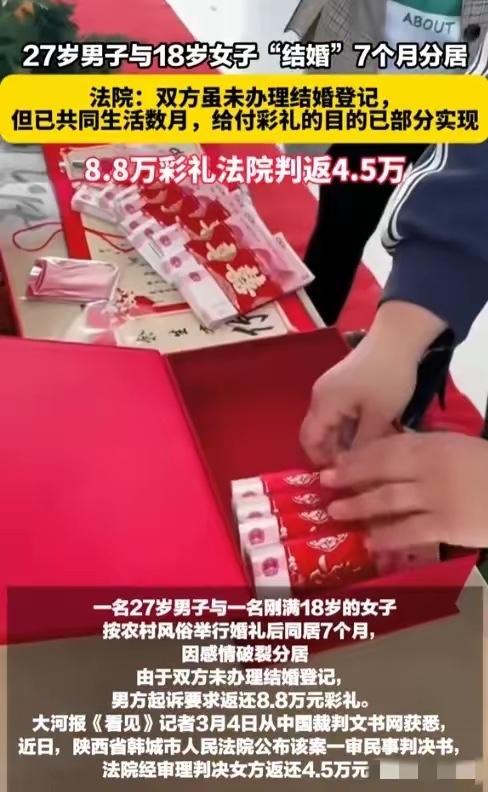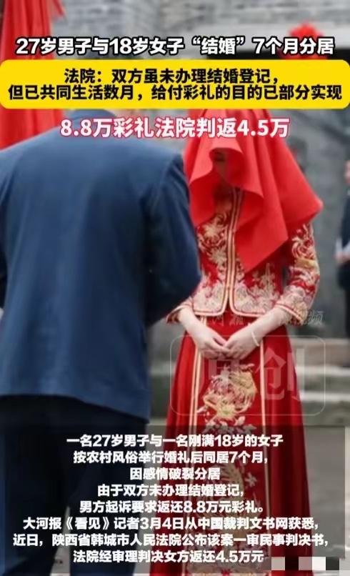 “悲剧还是发生了!”陕西渭南,27岁男子向18岁女子支付8.8万元彩礼,并与之举办婚礼。仅仅同居7个月,两人感情破裂而分居,女子与男子签订协议,答应退还8.8万元彩礼。女子迟迟不付后,男子将女子起诉至法院,女子称协议系遭胁迫签订,自己还两次怀孕流产,彩礼早就花完。法院这样判! 这件事发生在陕西,2023年10月,27岁的文某甲经人介绍认识了当时才18岁的许某某。两人很快谈起了恋爱。2024年1月,他们按照农村风俗热热闹闹办了婚礼。因为女方年纪太小,还没到法定婚龄,所以没领结婚证。 订亲和办婚礼前,男方家里前前后后给了女方家十万多块钱。其中明确算作彩礼的,是八万八。还有六千六的“糖钱”,六千块的烟酒钱,五千块的物品费。两家人都觉得,这婚事算是成了。 小两口住进了男方家,开始过日子。可这日子没过多久,矛盾就来了。一个27岁,一个18岁,年龄差摆在那儿,想法、生活习惯处处不合。到了2024年5月,两人开始频繁吵架。8月,许某某干脆收拾东西离开了,这段“婚姻”只维持了七个月。 人走了,钱的事就得说清楚。2024年12月,两人签了一份协议,白纸黑字写着,许某某答应一次性退还那八万八的彩礼,还打了张欠条。可签完字,许某某却迟迟没有还钱的意思。 文某甲等不及,一纸诉状把许某某告上了法庭。法庭上,许某某说出了另一番话。她说,那份协议不是自己真心想签的,是受了胁迫,被逼着写的。她还说,那八万八的彩礼,早就花得一干二净了。 许某某列了个单子:给男方买婚戒花了六千二,买婚庆床品等花了一万五,给男方的“改口费”两千,回门礼两万。她还说在同居的七个月里,自己两次怀孕又流产,光是营养费、医疗费就花了差不多三万。 同居期间,男方没有稳定工作,几乎没收入,还多次让她回娘家要钱来维持日常开销。言下之意,彩礼钱都贴补到共同生活里了。 法院审理后才捋清楚,双方确实没领结婚证,从法律上讲不算夫妻。但两人以夫妻名义共同生活了几个月,彩礼给付的目的已经部分实现,不能要求全部返还。 法院认定,那八万八是核心彩礼。至于“糖钱”、烟酒款等,属于筹办婚礼的花费,不算彩礼。女方说的婚庆用品和回门礼,因为证据不足,法院没采纳。 最后法院考虑了女方的实际付出和损失。她为男方购买婚戒的六千二,她父亲支付的改口费两千,这些钱确实花出去了,应该从彩礼总额里扣除。这样一来,需要处理的彩礼金额就变成了七万九千八。 陕西省韩城市人民法院综合考虑双方共同生活了七个月,以及女方曾两次怀孕流产的事实,判决许某某返还文某甲彩礼款四万五千元。 一场匆忙的“婚礼”,两个不够成熟的年轻人,八万八千块的彩礼,七个月的同居生活,两次身心的创伤。这个判决,没有支持男方全额返还的请求,也没有无视女方的付出与伤害。它试图在冰冷的金钱数字和复杂的情感现实之间,找到一个平衡点。 农村地区常见的“先办事、后领证”现象,是早早订婚结婚的年轻男女面对现实生活时的无措,更是高额彩礼背后两个家庭的经济压力与期待。当婚姻的承诺无法兑现时,当初那份厚重的“礼金”,就成了一笔最难算清的账。 彩礼,是以缔结婚姻为目的的赠与,婚姻关系不存在了,彩礼应当返还。但返还多少,必须实事求是。要扣除已经用于共同生活的部分,更要考虑到女方在关系中的实际付出,尤其是怀孕、流产对女性身体和心理造成的不可逆的伤害。 婚姻不是买卖,感情无法用金钱完全衡量。在开始一段关系前,多一些了解,多一些慎重,或许比事后对簿公堂,争个面红耳赤,要重要得多。 各位读者你们怎么看?欢迎在评论区讨论。