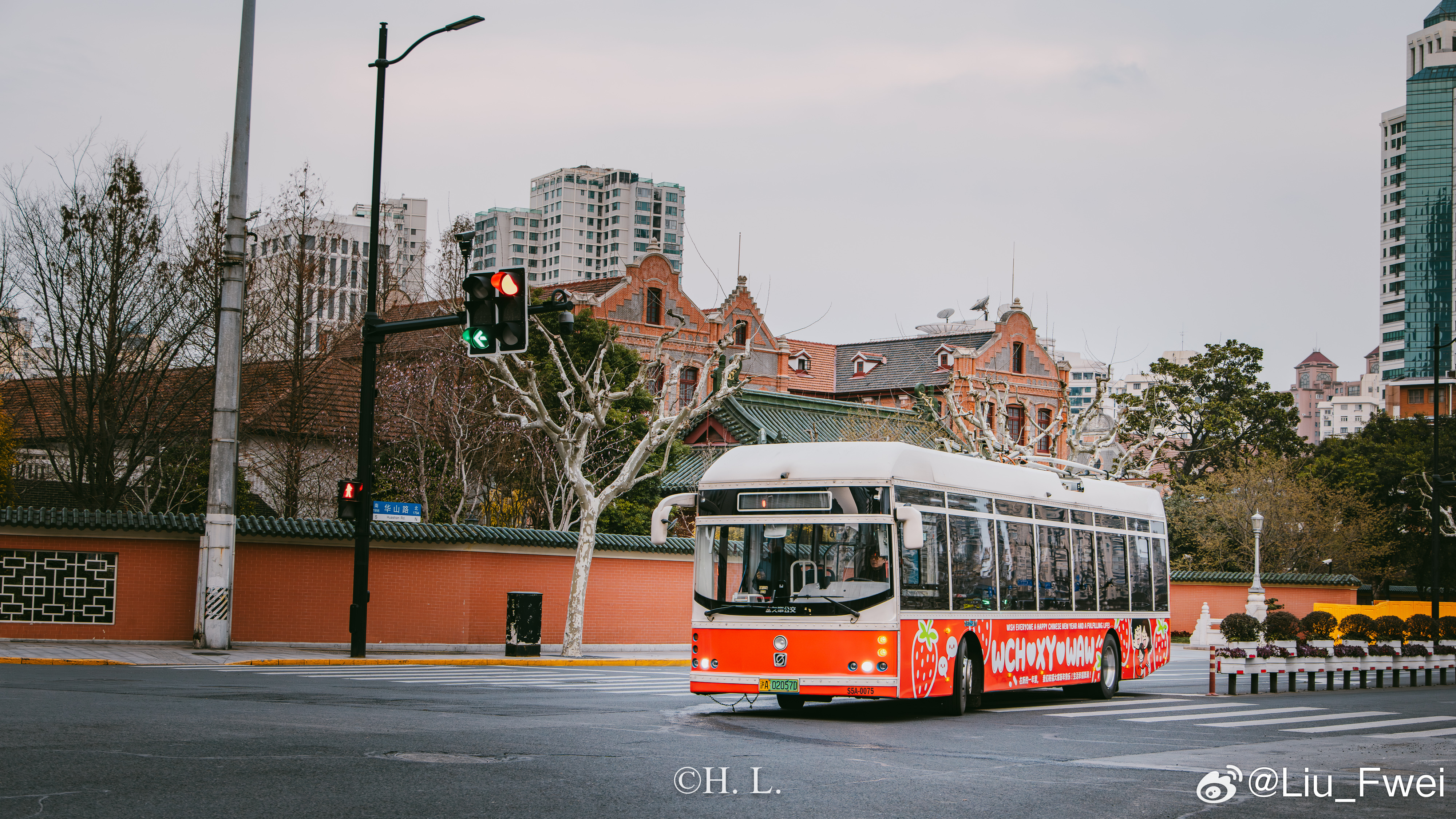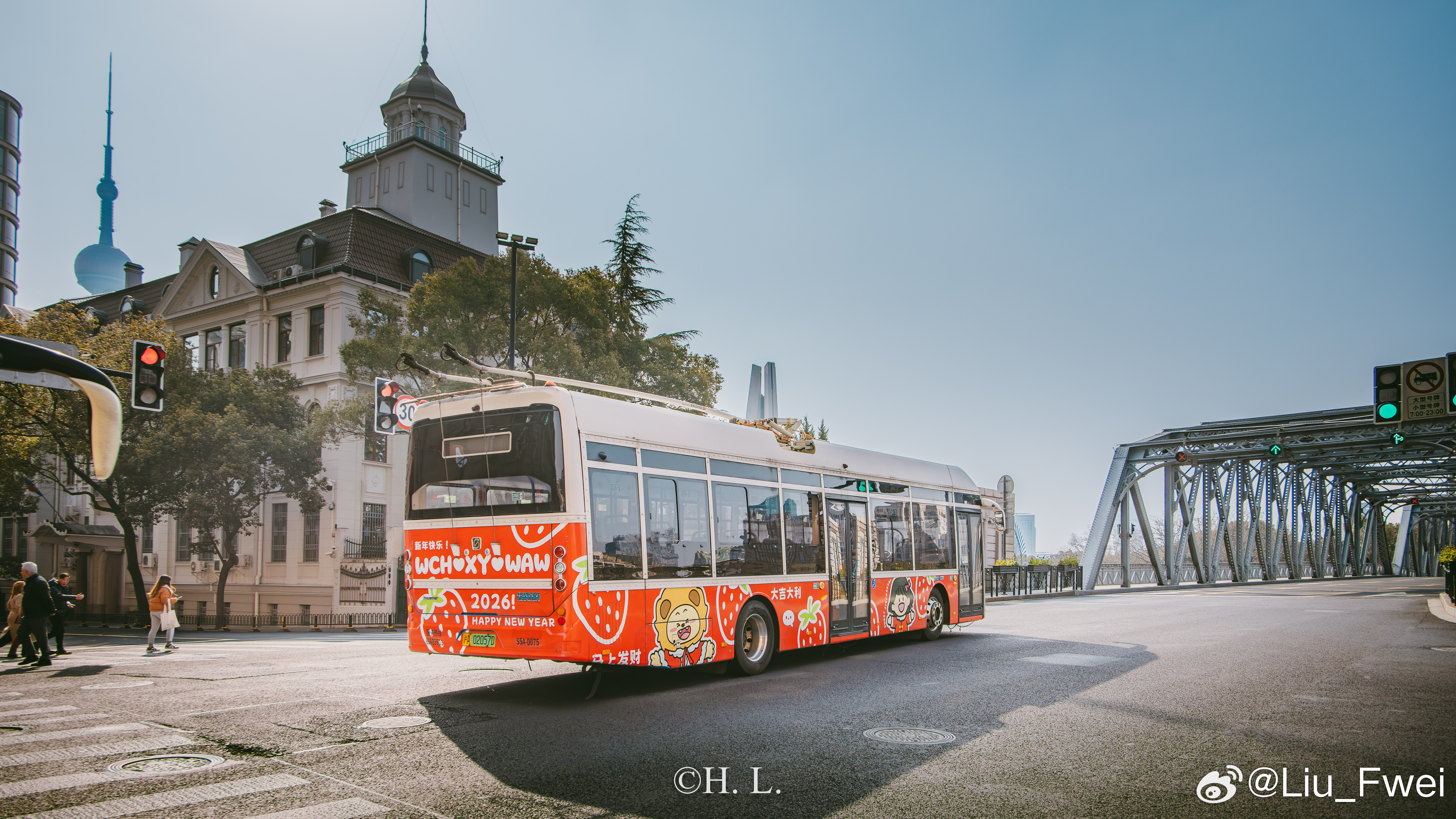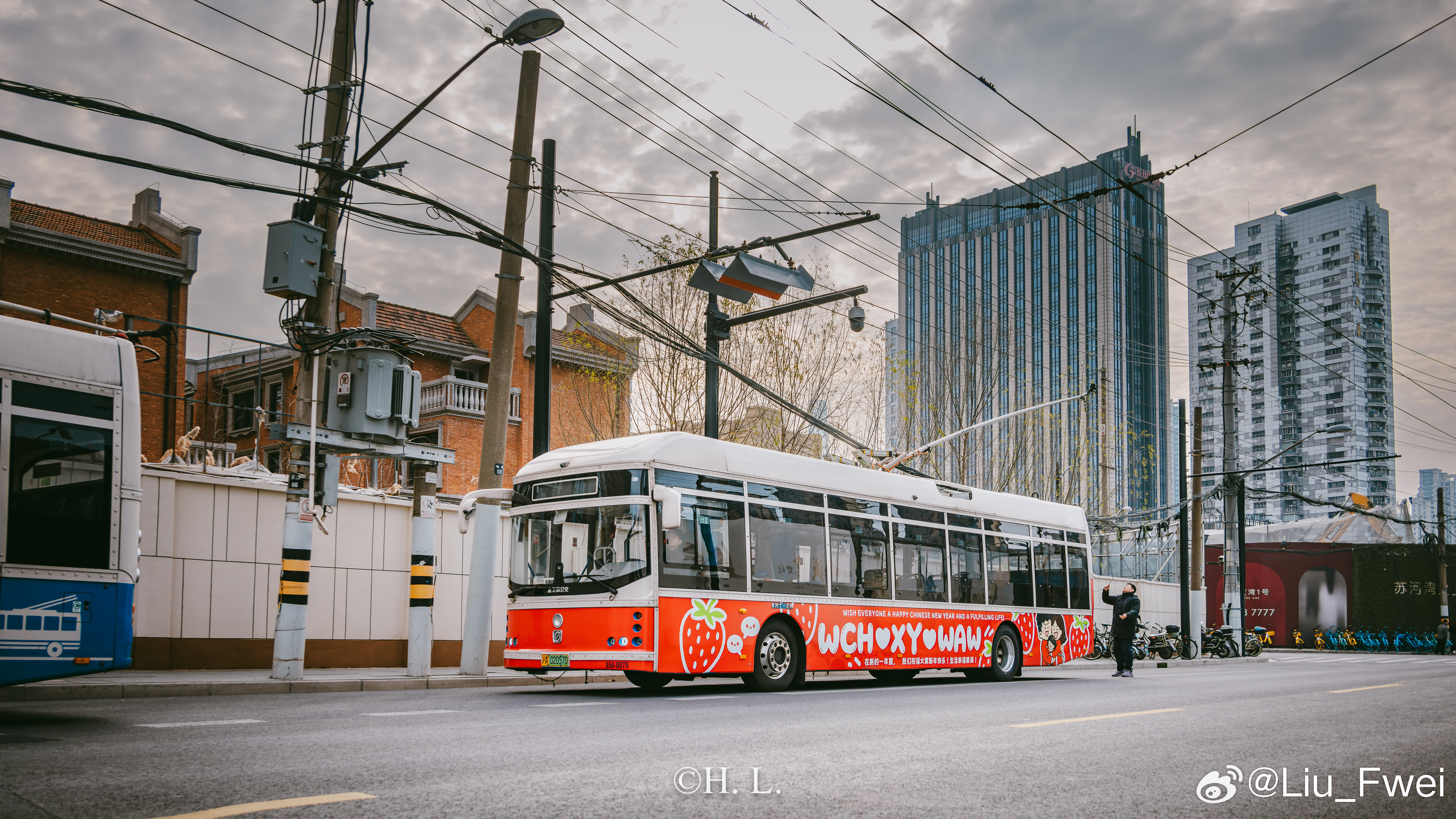 今天,投放的广告车作为特约车拍了一些广告片段。广告拍摄的主要地点为天平路淮海中路、中山公园、浙江北路天目东路和外白渡桥。有幸和广告公司一起参与了其中的部份活动,拍了点照片。图1: 交通大学。广告车在早晨六点准时出场前往天平路淮海中路,在车辆经过交通大学的时候,我按下了快门,以此纪念一下26路。图2: 天平路淮海中路。这是26路无轨电车的经典走向。图3: 武康大楼。也是26路的经典走向,投放人期望通过这样的方式来纪念逝去的26路无轨电车。电车沿着淮海路绕了两圈,可惜因为是随拍,我带的器材也比较随便,所以也没办法在一张照片中同时容纳电车和武康大楼。图4: 中山公园万航渡路站。也是今天重要的取景位置。投放人为了纪念他与13路无轨电车曾经深厚的感情而选择这个位置。可惜当电车抵达的时候,20路的2004号主题车恰好离开,失去了双车合影的机会。图5:天目中路随拍。接下来沿着13路的路线前往浙江北路。由于车辆电池电量急坠,不得不补充一点电量。图6: 浙江北路天目东路。又一个定点拍摄广告的地方。图7 图8 图9: 外白渡桥。最后一个拍摄位置,为动态拍摄。