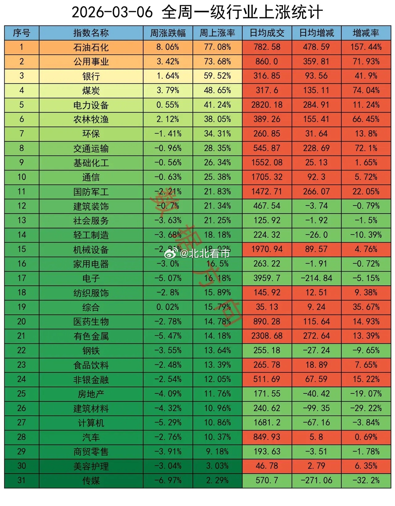 石油石化、公用事业(天然气、电力)、煤炭、农牧(化肥、粮食),一起进入本周行业榜单前6名