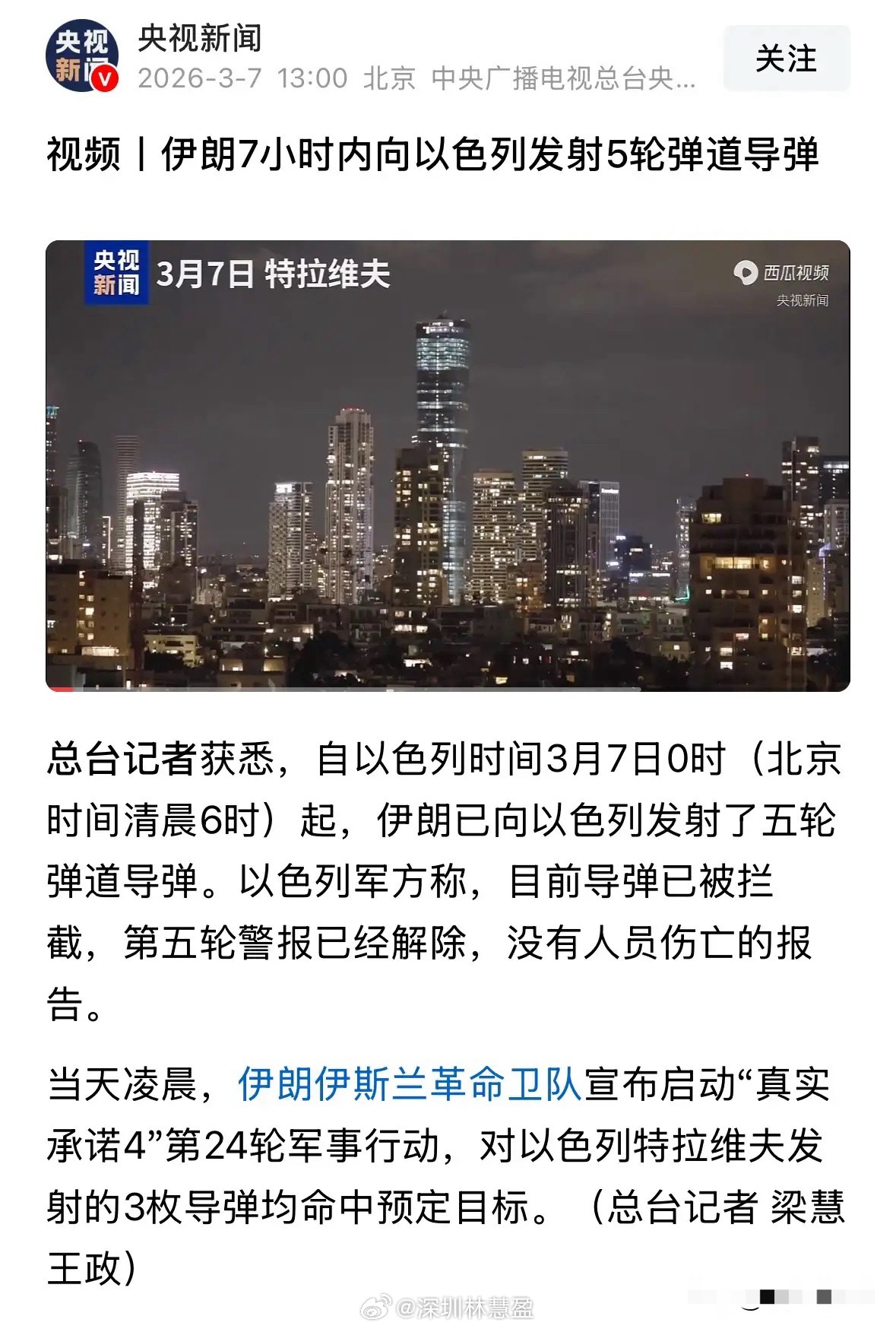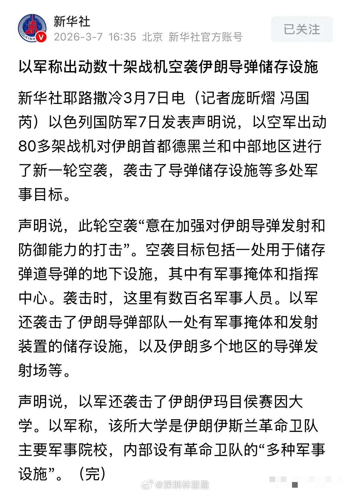 新华社发布重磅消息以色列再出动几十架战机轰炸伊朗,中东局势缓和还是恶化:数据不会说谎!3月7日美国和以色列轰炸伊朗进入第八天,中东局势真实情况到底如何?根据新华社和央视今天下午最新消息,以色列今天再次出动了几十架战机轰炸了伊朗有数百名军事人员的导弹储存和军事指挥中心,还轰炸了伊朗的军事学院,伊朗也向以色列发射了五轮导弹,但以色列没有伤亡报告。根据豆包提供的伊朗发动导弹和无人机数据,可以清晰看到中东局势在缓和:伊朗3月7日发射总导弹从第一天的350枚降到了15枚,15枚导弹中五轮发向以色列,每次按2枚算也有10枚,以色列基本上没有伤亡。无人机今天降到12架,这点导弹和无人机吧,基本上防空系统不会有压力,整体看中东局势没啥事了,到明天估计伊朗发射导弹和无人机能力会降到个位数甚至基本为0,所以东航今天也开始恢复航班了,各国都在恢复领空,以色列定的计划是3月8日恢复领空,基本上到明天中东地区就和平了,这利好全球股市,包括A股和港股,所以下周一股民不用担心,3月9日中东地区就基本安全了。