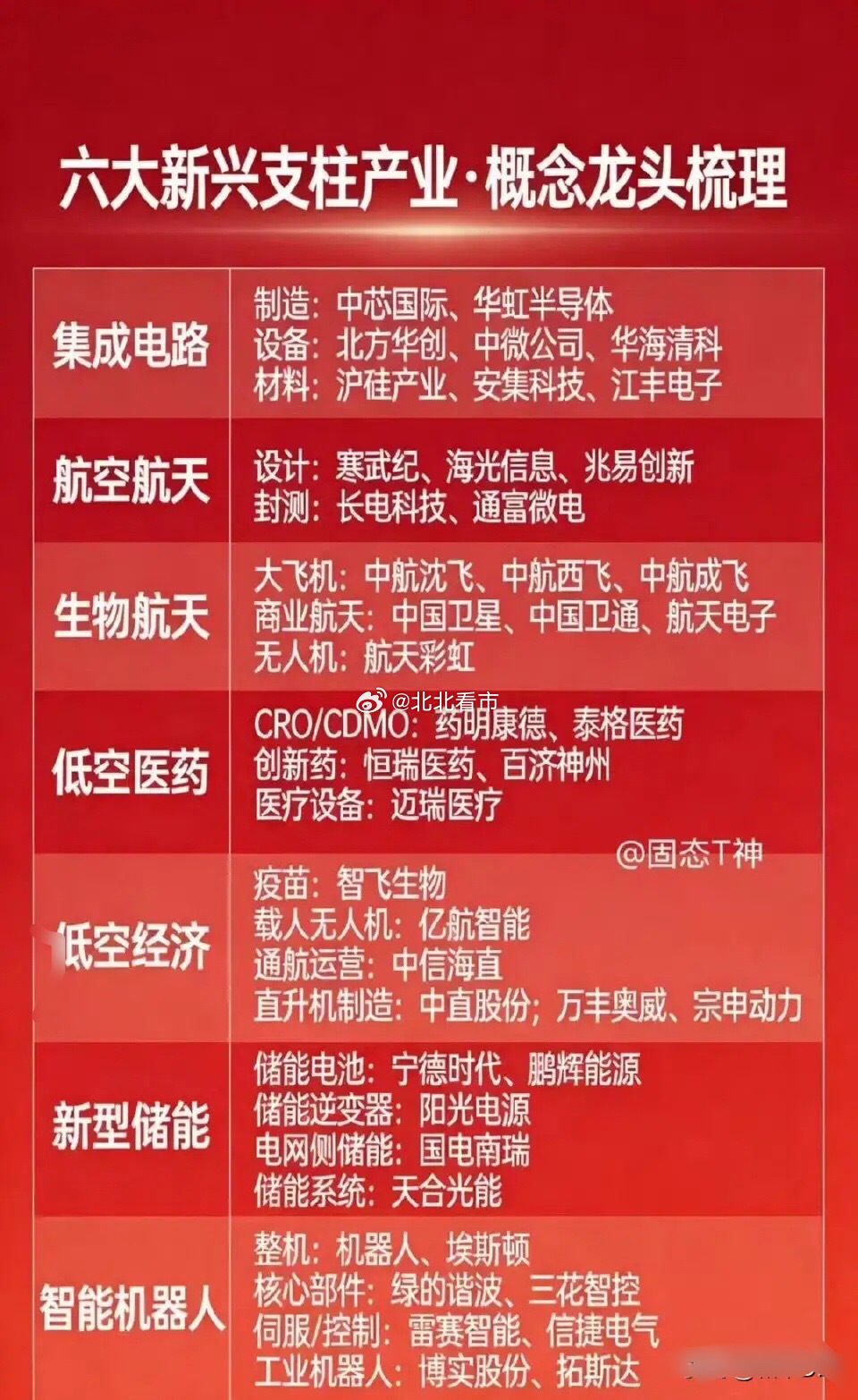 十五五六大新兴支柱产业龙头速查!1.【国产替代·硬刚需】(优先级最高,防守性强)集成电路: 制造中芯国际;设备北方华创;材料沪硅产业智能机器人: 核心部件绿的谐波;伺服雷赛智能新型储能: 逆变器阳光电源;电网国电南瑞2.【政策红利·风口期】(弹性最大,易出行情)航空航天: 整机中航沈飞/中航成飞;商业航天中国卫通低空经济: 载人亿航智能;制造中直股份生物医药: 创新药恒瑞医药;CRO药明康德3.【业绩兑现·护城河】(增长稳定,持仓核心)集成电路: 设计看海光信息;封测认长电科技新型储能: 电池宁德时代;系统天合光能智能机器人: 整机埃斯顿;工业机器人拓斯达