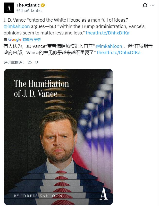 《大西洋月刊》:“有人认为,万斯带着满腔热情进入白宫,但在特朗普政府内部,他的意见似乎越来越不重要了”。 这几天美国副总统万斯几乎很少出现与发帖,这是他刚刚转发的内容。从2月27日到今天,总共发帖3个。