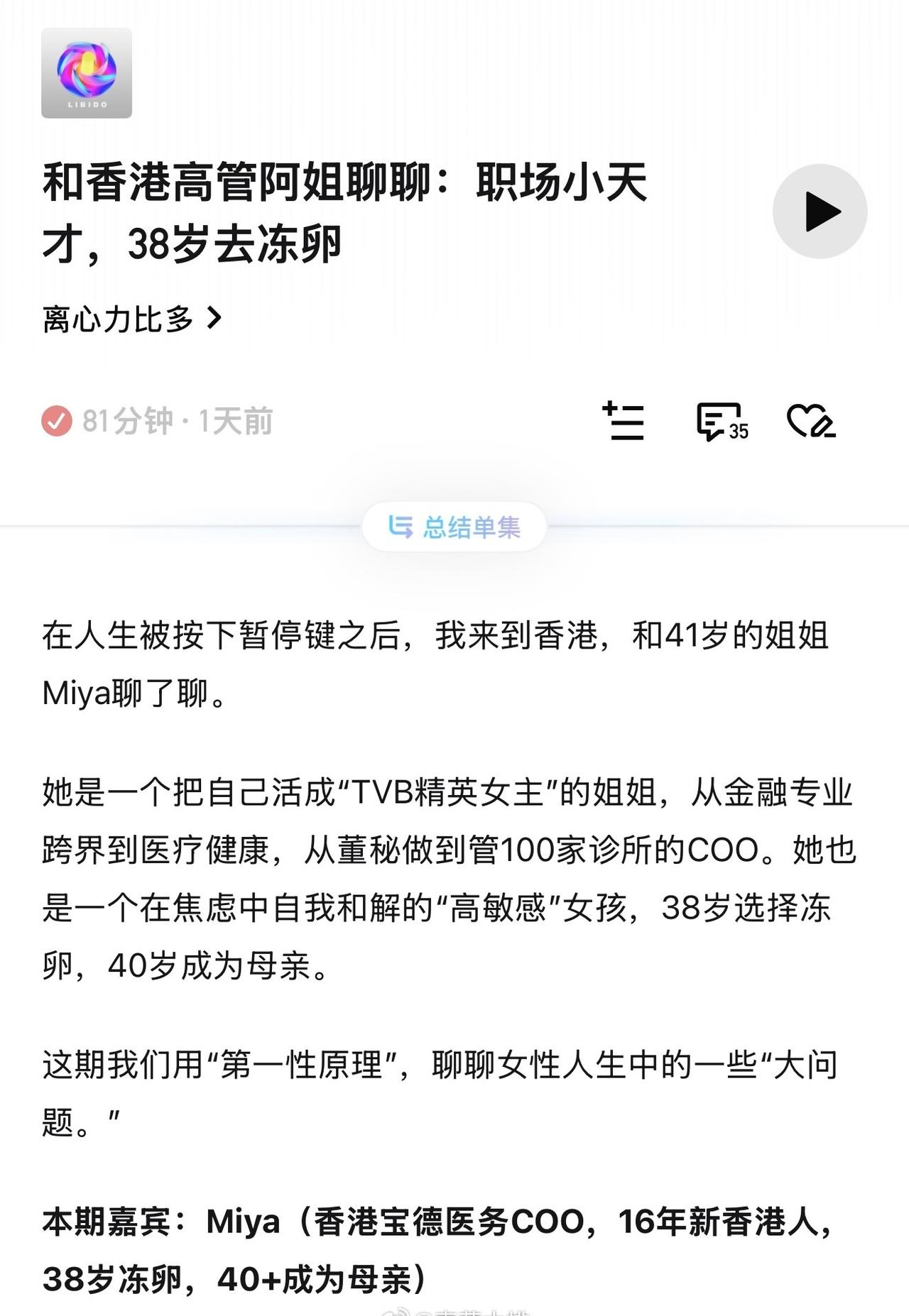 “生育真的是卡在30到40岁的女孩之间一个非常大的需要思考的问题” 听了离心力比多这期壁仔对话Miya,感觉促排和取卵也没那么焦虑… 适龄女性生不生育都要每年检查AMH哦!