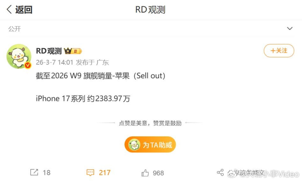 【iPhone17国内销量破2300万】iPhone17国内最新销量 3月7日,根据博主发布的最新数据,截至2026年第九周,iPhone 17系列的市场表现惊人。该系列的累计销量已经达到约2383.97万台,这一数字远超同期发布的任何一款安卓旗舰机型。