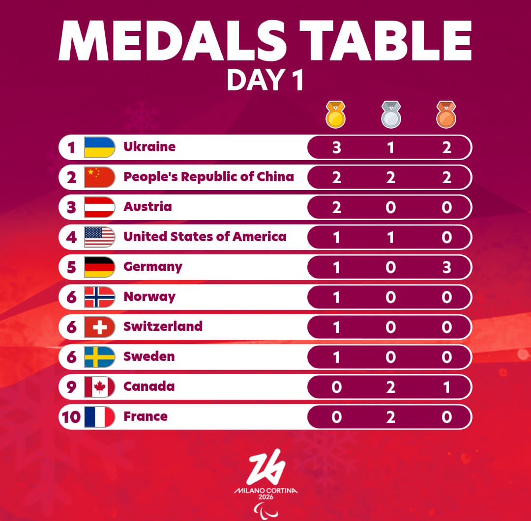 冬奥会 米兰冬残奥会第一日奖牌榜,中国以两金两银两铜,暂列第二位!此刻皆不凡