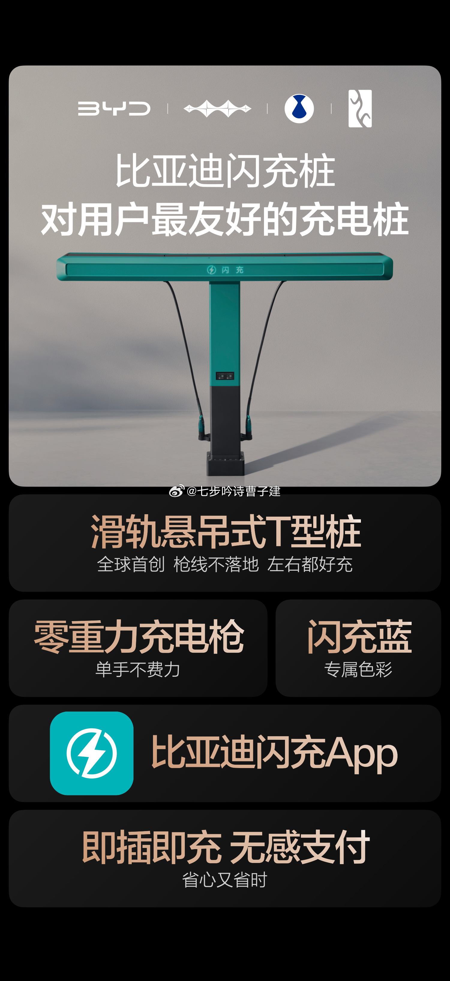 我在这里给小伙伴们提个问题哈:你们给车充电的时候有没有被绊过?这个问题被比亚迪解决了。比亚迪最新的闪充电桩是T字形设计,充电线通过滑轨倒吊下来,不接触地面,而且还节约了充电线和充电枪的重量,甚至比很多加油站里的加油枪还轻。曹老板觉得对于很多车主来说,这简直是一个太太太友好的创新设计啦,悄咪咪(×)明晃晃地给比亚迪点个赞~
