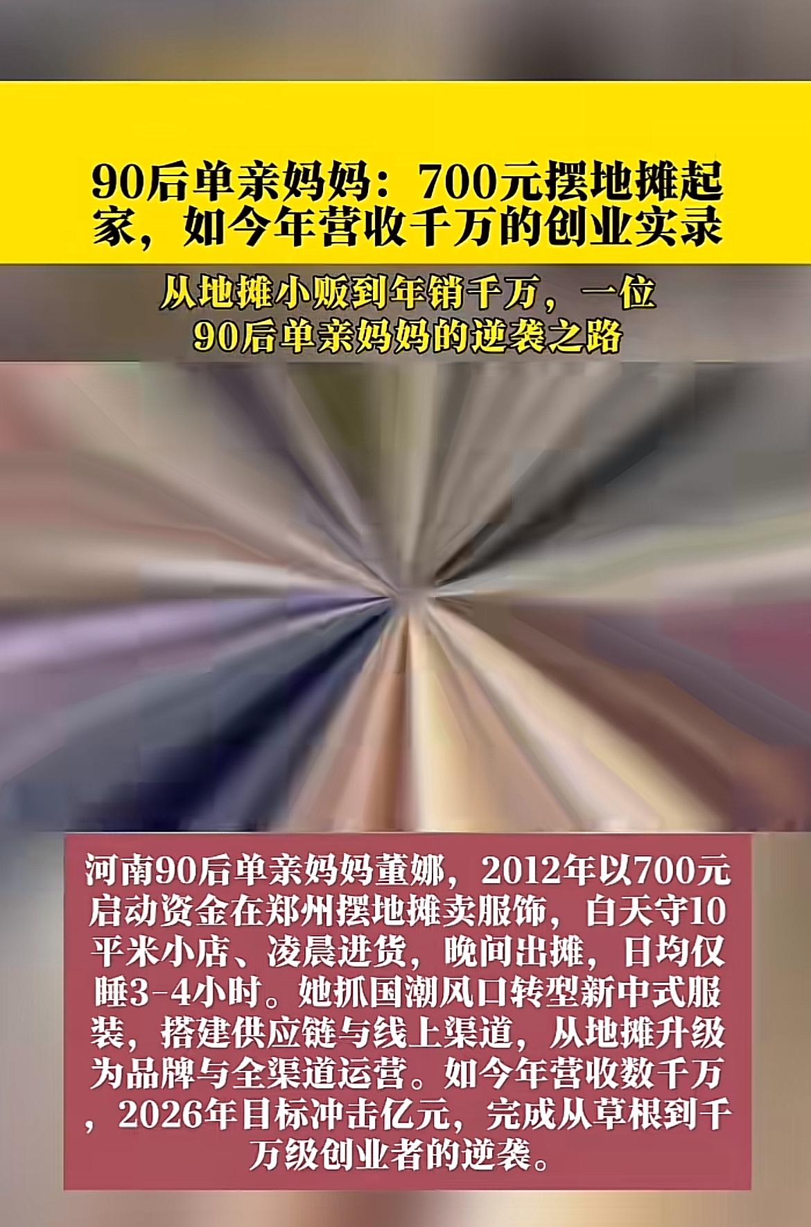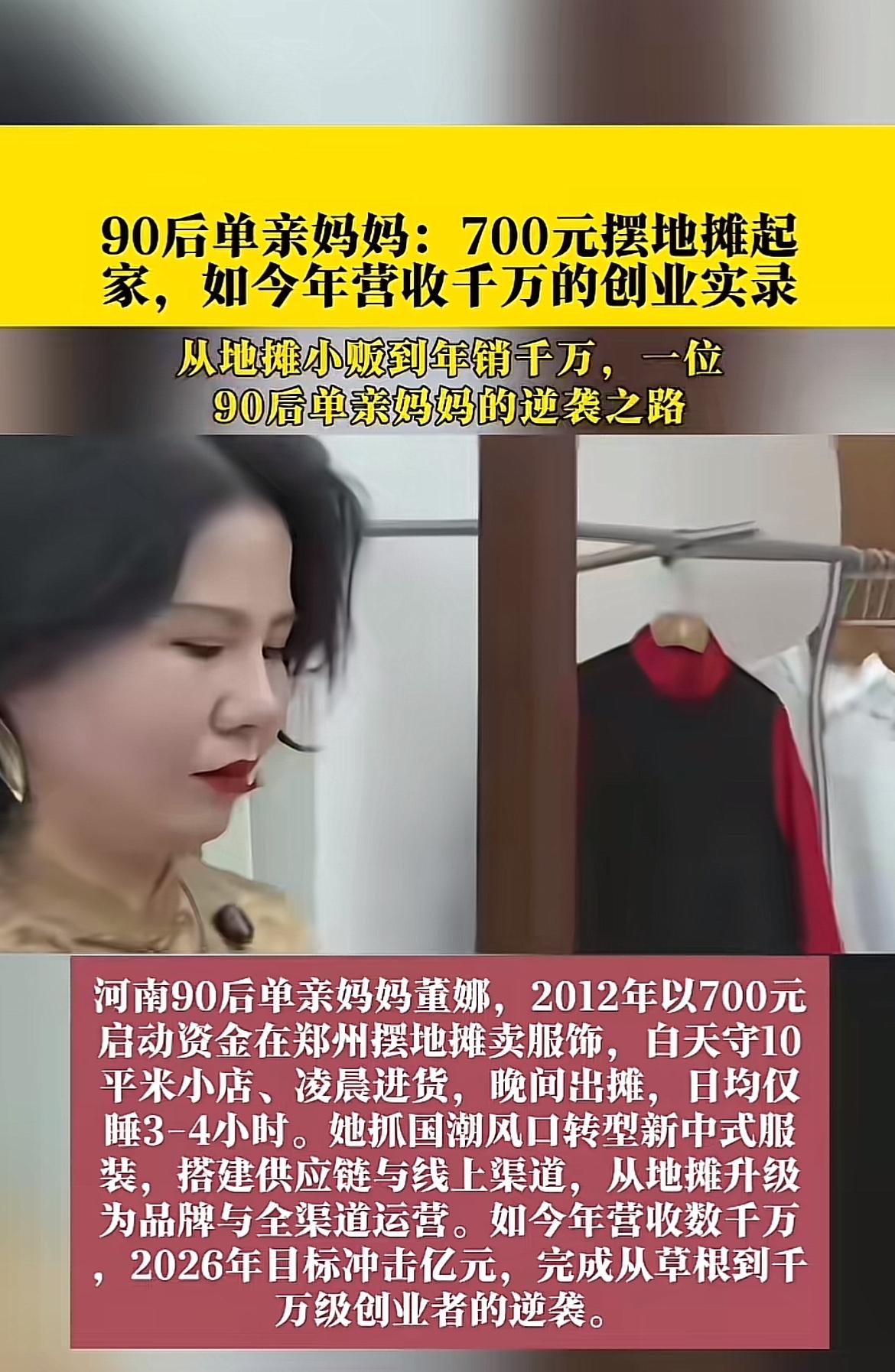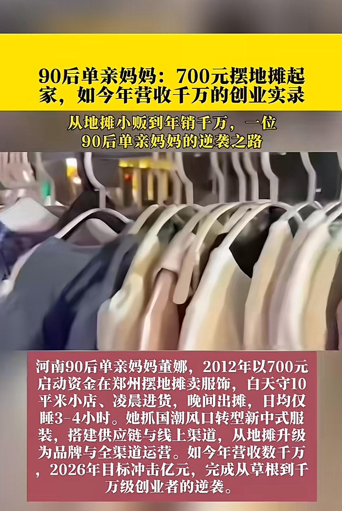 最近,我看到了两个90后单亲妈妈的逆袭故事,着实令人震撼。 河南的董娜,2012年怀揣着700元摆地摊卖衣服。她的第一家店仅有10平方米,为了孩子,她每日只睡三四个小时,进货、守店、摆地摊连轴转。创业时,她遭遇坑骗、饱受刁难,却从未放弃。后来,她凭借独到眼光选对款式,生意渐有起色。国潮兴起,她果断转型做新中式服装,如今年收入达数千万,今年的目标是一个亿。 还有苏瑶,离婚后白天打工,晚上摆地摊卖手抓饼,第一天就被城管追赶,她躲在厕所里哭泣。但她敏锐发现夜市人群的需求,花8000元买了餐车,推出套餐,营业额从150元飙升至2500元。2022年,她将生意做成了千万产业。这两位妈妈的故事告诉我们,努力与眼光能够改变命运!