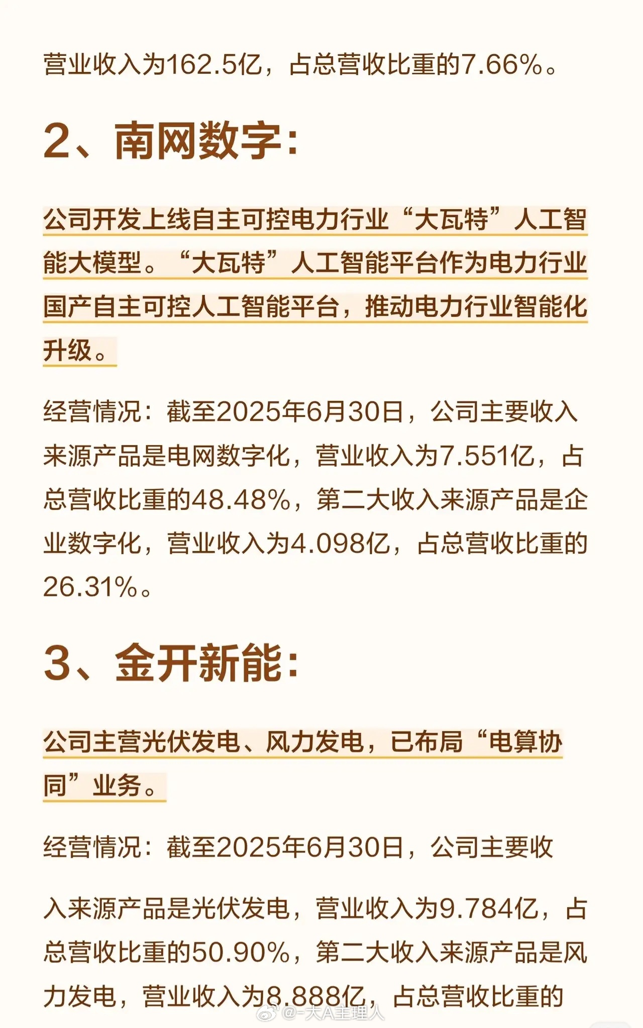 1. 中国能建:深度参与全国算力枢纽和数据中心项目,发挥“数能融合”优势。2. 南网数字:开发自主可控的电力AI大模型“大瓦特”,推动行业智能化。3. 金开新能:主营风光发电,已布局“电算协同”业务。4. 协鑫能科:采用“能源资产+服务”模式,运营智算中心,投运超千P算力。5. 中恒电气:通过数据中心电源业务助力智算中心实现“三零”目标(零故障、零工程、零损耗),达成算电协同。6. 同力天启:与庆阳签约建设储能产线和电站,探索智能调度模式。7. 安靠智电:子公司签订青海绿算产业园变电站EPC项目,是当地试点标杆。8. 豫能控股:拟参股控股股东旗下算力公司并收购IDC资产,切入算力运营领域。