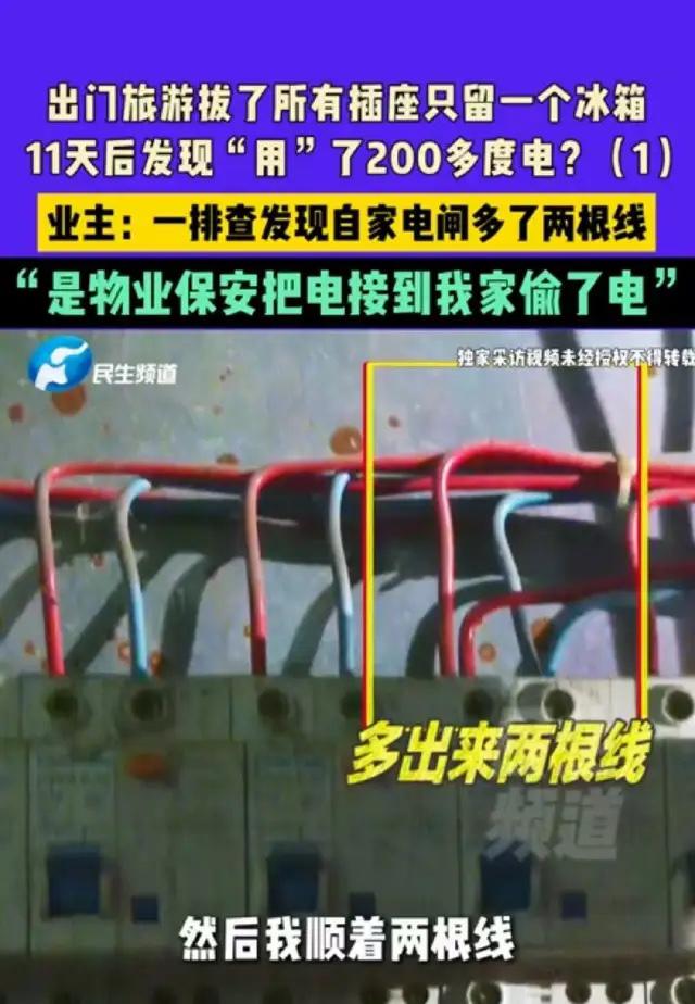 “悲剧还是发生了!”河南新乡,朱先生一家出去玩,临走把所有插座都拔了,只留一个冰箱,结果短短11天冰箱用了200多度电。朱先生回家后排查,发现费电的并不是冰箱,而是小区保安从他家电箱里接线偷他的电,更可气的是,保安屋里哪怕没人,暖气片还一直开着! 这事儿发生在今年大年二十七。朱先生和妻子高高兴兴出门旅游,想着就出去十来天,家里电器全断了电,只留冰箱开着保鲜食物。怎么算,这电费也多不到哪儿去。 十一天后,夫妻俩回到家。一看电费账单,两人都懵了。两百多度电!这够平时家里用一个月了。一台冰箱,再怎么耗电,也不可能这么夸张啊。 朱先生赶紧找来电工师傅帮忙查,这一查,可把他气坏了。电工打开家里的电闸箱,发现里面凭空多出来两根陌生的电线。顺着电线一路找,线头竟然通到了小区里一个闲置的储藏间。 推开门一看,里面住着人,正是小区的保安。更让人无语的是,屋里摆着两个大暖气片,正呼呼地散着热。保安自己说,他们住这儿,冬天冷,就用电暖气取暖。人不在的时候,暖气片也从来不关,就一直那么开着。 朱先生当场就火了。自己交着物业费,请来的保安,反倒成了“家贼”?他立刻找到物业公司讨说法。没想到,物业负责人的回应,差点把他气笑了。 负责人说保安是看那房间空着,自己搬进去住的。至于那两根电线是谁接的,他们“不知道”。负责人甚至还蹦出一句“金句”:“全球所有的事都是因为巧合才成了故事!” 这话听着,就是摆明了不想负责。保安是你物业的员工,住在你管理的小区公共区域,私接业主家的电线,你说你完全不知情?谁信呢。每月查电表,就只看个外壳数字,里面多了两根线,就没人发现? 朱先生一家选择了报警,还联系了媒体。记者一来,物业的态度立马就变了。面对镜头,他们再也说不出“巧合”这种荒唐话。 在事实和舆论压力面前,物业终于松了口。承认是管理上的疏忽,承诺会赔偿朱先生一家的电费损失,辞退涉事的保安,并且全面排查小区里所有的储藏间,杜绝类似事情再发生。 这件事,表面看是保安贪小便宜偷电。往深了想,暴露的是物业管理的严重失职。保安能轻易撬开闲置房住进去,能神不知鬼不觉地从业主电箱接出线来,而且长时间没人发现。这说明日常巡查、设备检查都是形同虚设。 物业的第一反应不是解决问题,而是推卸责任,用一句轻飘飘的“巧合”来搪塞业主。这种态度,比偷电本身更让人心寒。业主花钱买服务,买的是安全和放心,不是给自己添堵,请来个“电耗子”。 长时间出门,最好把家里的总电闸拉掉。既省电,也安全。平时交电费,也多留个心眼,看看用电量有没有异常波动。自家的电表箱,偶尔也打开看一眼,有没有多出什么不该有的东西。 信任建立起来难,破坏起来却很容易。一次“偷电”,寒的是所有业主的心。物业公司要想赢得尊重,靠的不是嘴皮子,而是实实在在的责任心和行动力。 各位读者你们怎么看?欢迎在评论区讨论。