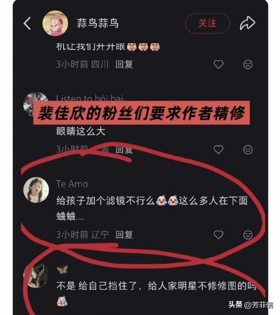 路人晒合照有为明星修图的义务吗? 近日,有网友在某公共平台分享了偶遇童星裴佳欣的合照,照片中的她,和大众印象中出入不小,失去了童年的惊艳感看起来泯然众人,面对大打折扣的颜值,评论区震惊声连连,一堆人直言裴佳欣变难看了长残了,而更多的,则是认为原图直出不礼貌,呼吁博主精修后再发出来。 在各种围攻声中,博主最终妥协,用美颜精修图替换了原图。 这波观望下来,想说的是,路人晒合照到底有没有帮艺人修图的义务? 作为艺人,靠脸吃饭,在公众中维持光鲜亮丽的形象很重要,这种情况下,没有审美的“黑图”和砸人饭碗没两样,此外,艺人同意合照说明人不错没架子,背刺行为显然不厚道。 但是话说回来,艺人本身就长这样,生图这个效果不算难看,网友们的别扭感无非来自于看多了美颜滤镜,如果因为真实被审判,那以后大家注定活在一个滤镜包裹的世界下,实属自欺欺人。
