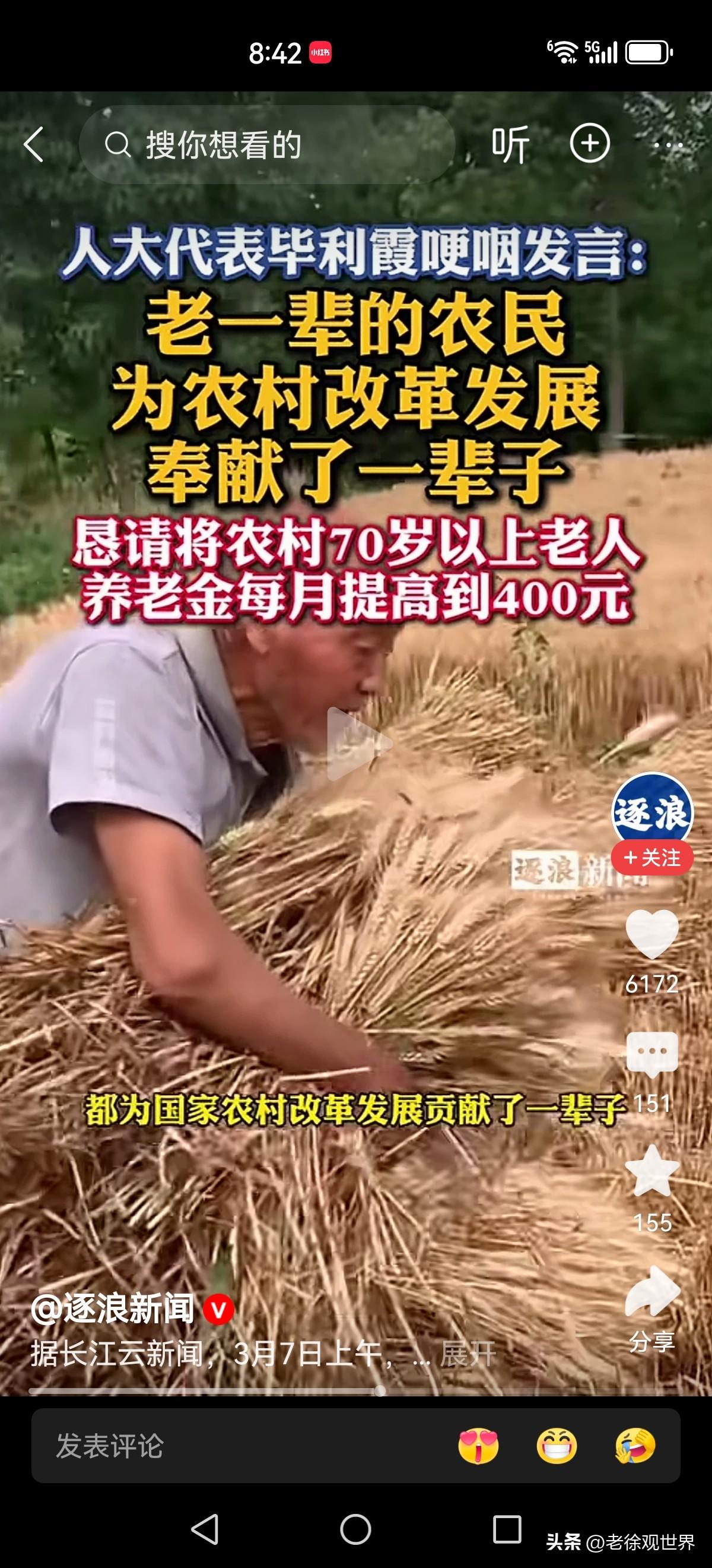 毕利霞代表哽咽的发言,道尽了亿万农村老人的辛酸与期盼。 老一辈农民面朝黄土背朝天,用汗水浇灌出国家粮食安全的根基,用辛劳托举起农村改革的起步。 如今他们垂垂老矣,肩不能挑、手不能提,每月百余元的养老金却难以覆盖最基本的温饱与医药开销。 将70岁以上农村老人养老金提至400元,不是“额外的福利”,而是对他们一生奉献的应有回馈,是守住晚年尊严的底线保障。 这份带着温度的建议,让我们看见基层代表与土地、与父老乡亲血脉相连的初心,更让我们期待,发展的成果能真正温暖到每一位曾为家国付出的老人,特别是农村老人!农村养老金60岁以上每月多少钱