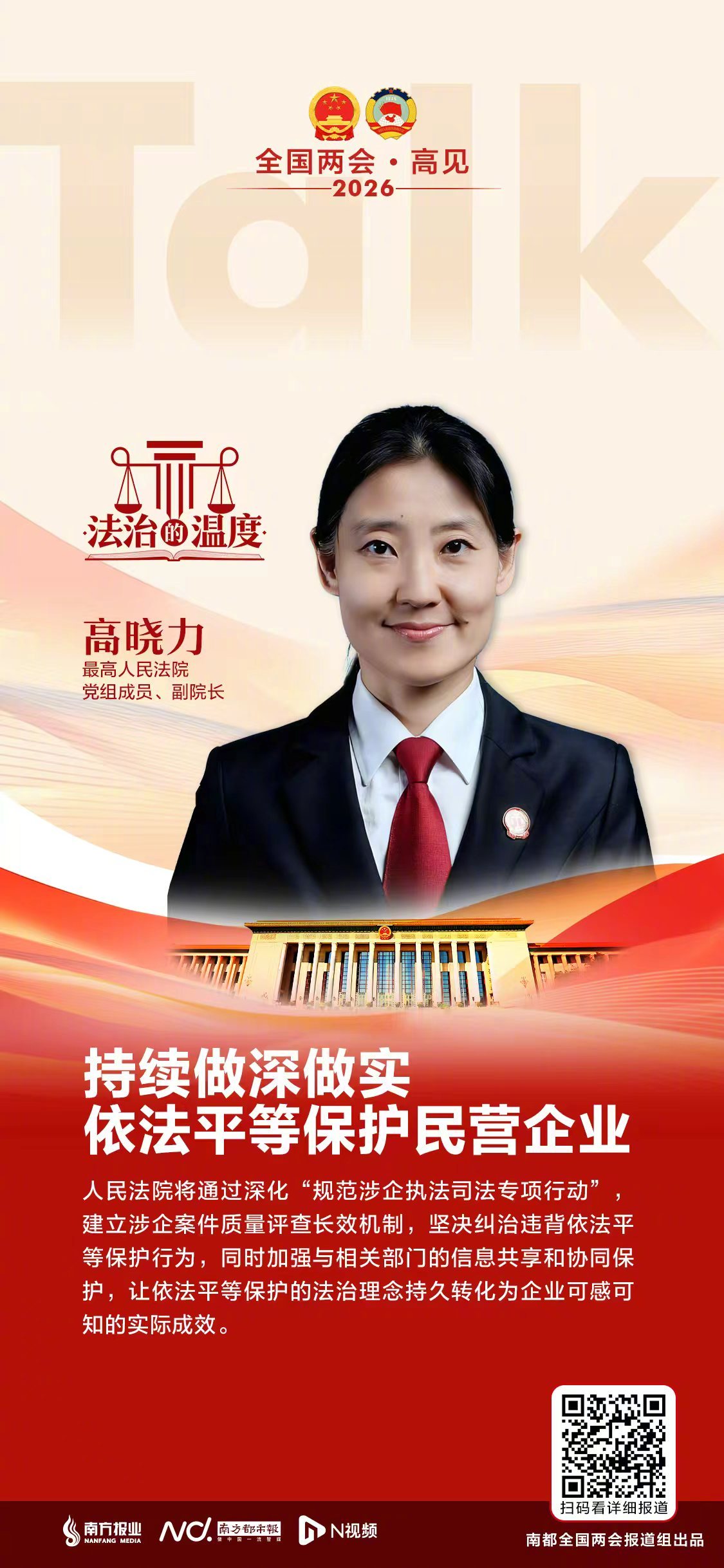 #高晓力谈依法保护民营企业发展#【专访最高法副院长高晓力:持续做深做实依法平等保护民营企业】#2026都看两会#公平竞争是市场经济的生命线,民营经济促进法的实施为平等保护民营企业提供了法律遵循。司法审判是保障政策落地的关键环节,审判实践中,人民法院如何贯彻“平等保护”理念?人民法院如何通过执法办案破除市场壁垒、促进民营企业公平竞争?
