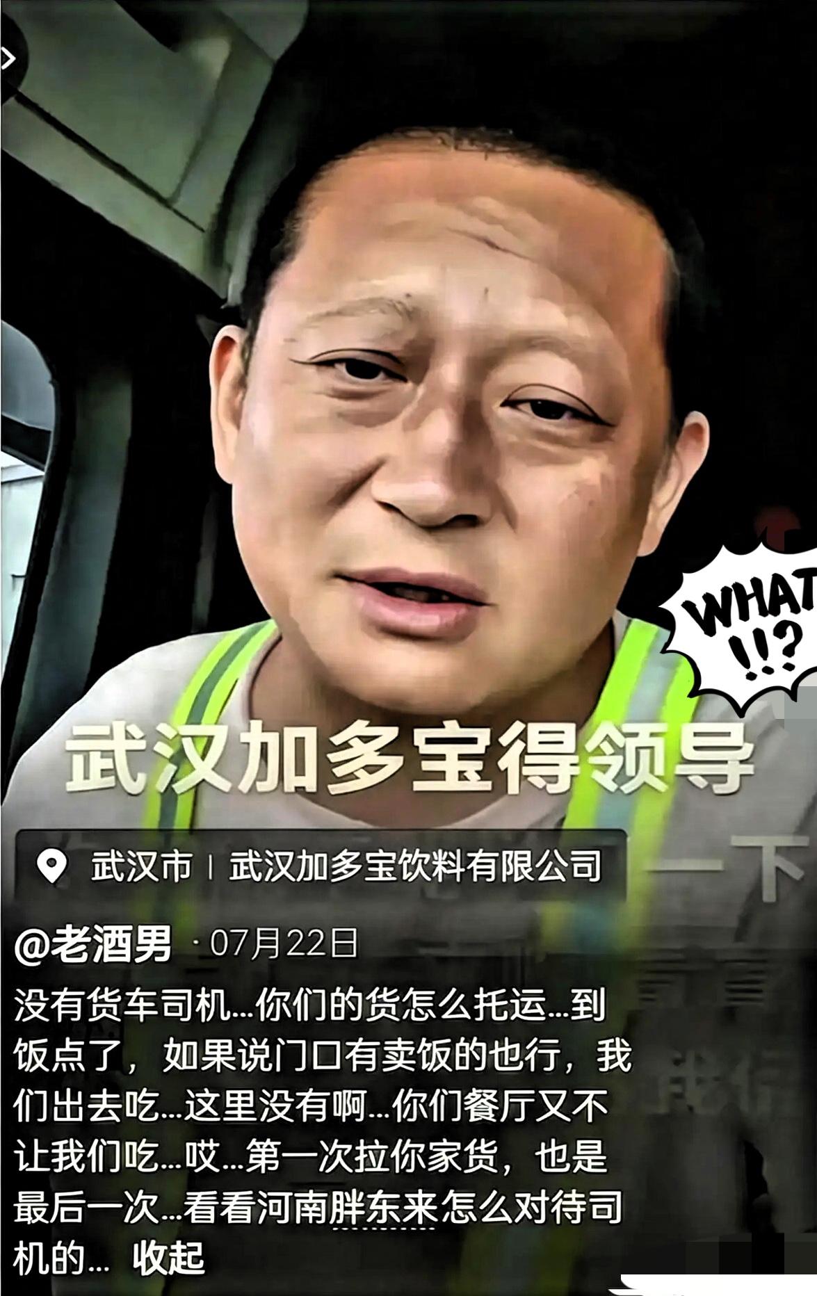 “世风日下,竟还有这么冷血之人,” 武汉一河南货车司机, 在加多宝工厂装货时想自费买份食堂饭,却遭 工人一句“你吃没吃饭关我什么事”怼回,满心委屈的司机拍视频喊话:“我也想被尊重!” 这事看似小,却戳中关键:尊重无价。司机自费求一口热饭,厂区位置偏,给个方便不难,大家都该有体面! 加多宝事后道歉整改,值得肯定,但这本就是该有的标准,尊重,是人和企业发展的根基。就像胖东来,把尊重做到极致才获称赞。 企业对人真诚,路才宽。