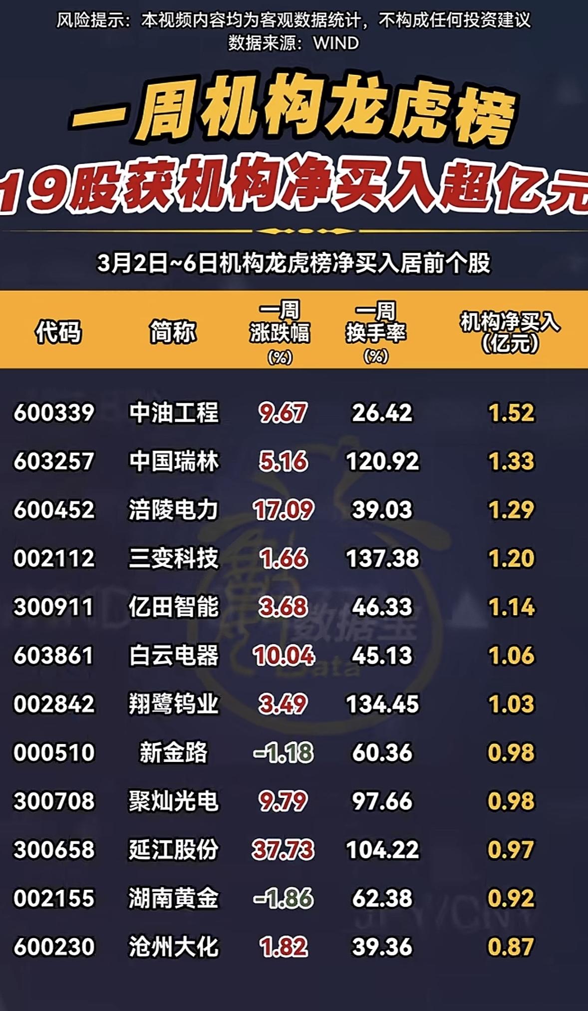 本周3月2日至3月6日机构龙虎榜:19股净买入超亿元,中油工程领涨! 一周机构龙虎榜太有看头了,19股净买入超亿元,中油工程领涨。就3月4日来说,市场行情一般,上证指数、深证成指、创业板指都下跌了。盘后龙虎榜有59只个股异动上榜,资金净流入最多的是通鼎互联,达3.54亿元,而中曼石油被净卖出6.51亿元。 机构方面,43只个股龙虎榜有机构身影,合计净卖出13.16亿元,净买入20股,净卖出23股。机构净买入最多的是石化油服,还实现了三连板。中油工程当日上涨2.14%,机构龙虎榜净买入7551.00万元,但主力资金近几日呈净流出状态。这股市风云变幻,真让人捉摸不透啊!