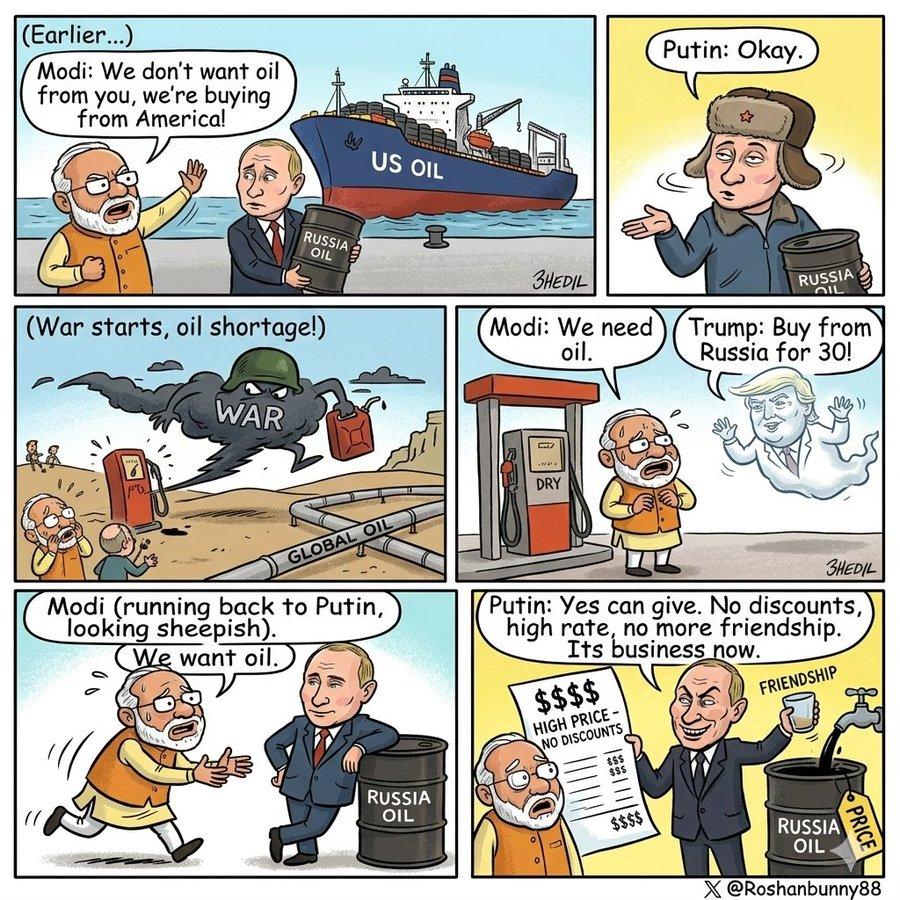 特朗普允许印度在30天内购买俄罗斯石油,但莫斯科方面却提高了油价,而且没有提供任何折扣。 显然,普京的策略要残酷得多…… 在莫迪与特朗普结盟、反对普京之后,俄罗斯以冷酷的算计予以回应。 印度表面没有选边站队,这是更加诚实的看眼前利益。印度表面与美国、俄罗斯、乌克兰、以色列以及伊朗都保持着良好的关系。 现在,印度只能从俄罗斯进口的大部分石油在提炼后会转售到欧洲,从中谋取更大价值。 因此,印度向欧洲出售石油的价格也会相应上涨,以确保印度不会蒙受损失。 持续不断的伊朗-以色列/美国战争引发的全球能源危机。俄罗斯提价除了市场原因外,谁能保证不是出于印美关系的考虑? 俄罗斯提高了对印度的燃油价格,据报道,3月至4月的交割价格比布伦特原油价格高出每桶4至5美元。 尽管价格上涨且折扣减少,印度仍在增加对俄罗斯进口的依赖,以抵消西亚冲突造成的供应中断。 印度人很会演戏。当美国要求他们停止购买俄罗斯石油时,他们就停止了;现在,为了缓解市场波动,美国又允许印度购买俄罗斯石油。 印度曾经是一个主权国家,现在印度的表现好像是一个殖民地。 美国给予印度30天的豁免期,允许其从俄罗斯购买石油,这不过是虚张声势,旨在避免尴尬。 即便霍尔木兹海峡近乎关闭,印度无论如何都会从俄罗斯购买石油。自2022年以来,印度一直在从俄罗斯购买石油,即使在美国施加如此大的压力下,也从未停止过购买。 如果有人威胁你,强迫你按照他们的方式行事,那他们就不是你的朋友。印度是“砖瓦联盟”的成员,只是维护组织的利益。而美国只关心以色列和美国自身的利益。 尽管原油价格低廉,而且印度还能以折扣价从俄罗斯购入石油,但印度人支付的石油价格却是美国的两倍。 普京对待印度人还算不错,一个附庸国就应该得到这样的待遇。 有些印度领导人自以为是世界上最聪明的人,但他们忘了,世界上还有许多国家拥有独立的思想和脊梁。 俄罗斯与印度的石油关系从来就不是建立在友谊之上的。2022年西方实施制裁后,印度成为俄罗斯原油折扣的最大买家之一,帮助莫斯科将出口转向欧洲以外的地区。 但能源贸易是一种杠杆。折扣的存在仅仅是为了服务于战略利益。一旦平衡被打破,定价权也会随之改变。 剧情出现了谁也没想到的转折。印度在美国的压力下减少了从俄罗斯进口石油,作为奖励,关税被降低了。 然后中东战火爆发,美国给了印度30天的豁免期,允许其重新从俄罗斯进口石油,而俄罗斯一夜之间立即将13美元的折扣变成了5美元的溢价。 一周之内波动了18美元。现在这片丛林里的每个国家都纯粹是交易者。印度并没有遭受羞辱,反而从中领教了权力运作的真谛。 没有人能赢得忠诚,只有筹码。 美以联合袭击伊朗王毅谈伊朗局势:拳头硬不等于道理硬伊朗称袭击以色列海法炼油厂
