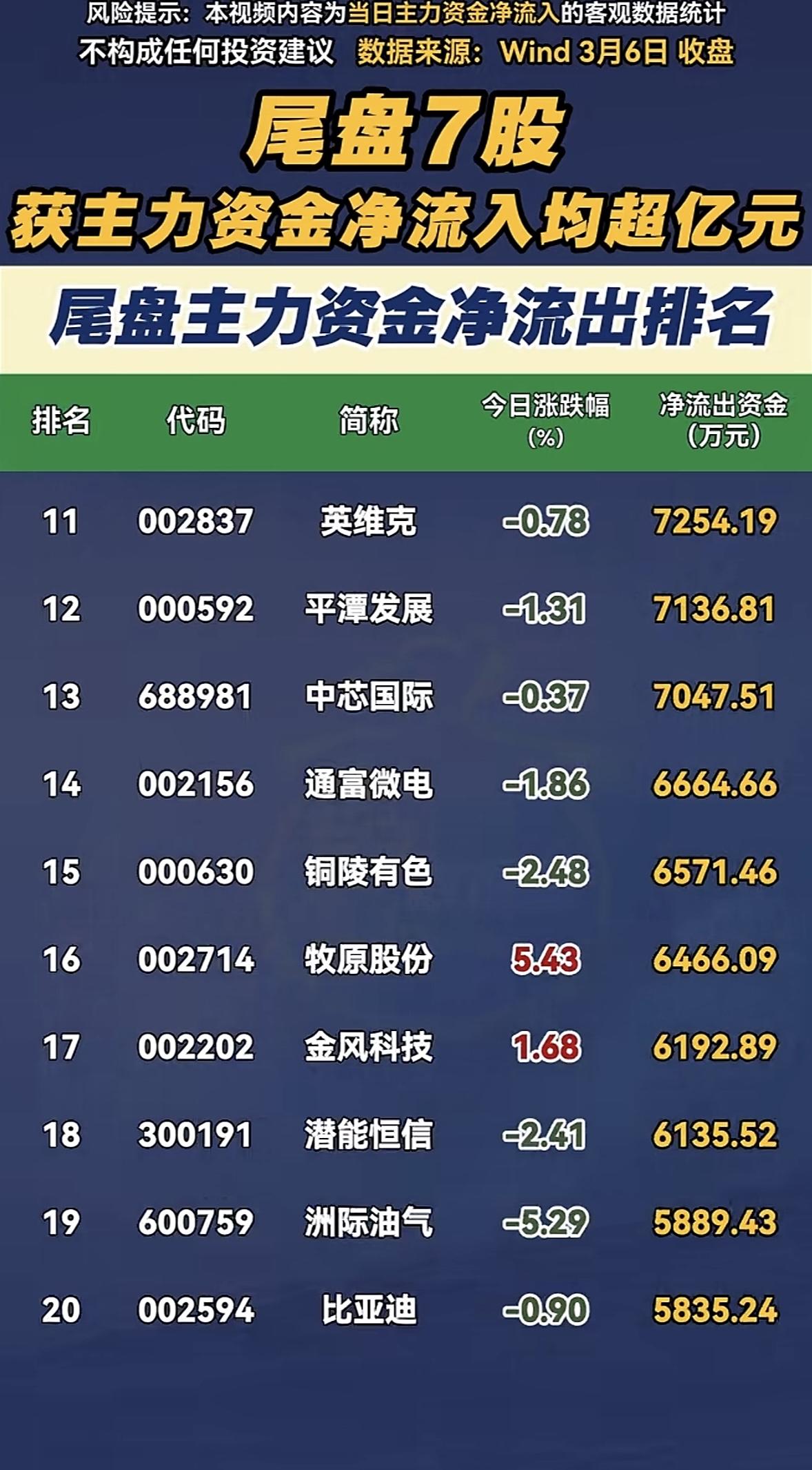 本周3月2日至6日尾盘7股主力资金净流出排行,超亿元大户动向揭秘! 本周3月2日至6日尾盘主力资金动向值得关注。3月4日,沪深两市主力资金净流出499.6亿,创业板净流出217.14亿,沪深300成份股净流出141.69亿。行业板块有涨有跌,国防军工和农林牧渔领涨,交通运输、石油石化和非银金融跌幅居前。 资金流向上,银行行业获主力资金净流入10.25亿居首,有色金属行业净流出超60亿居首。个股方面,62股主力资金净流入超1亿,洲际油气净流入12.15亿居首。3月2日,比亚迪、海格通信等尾盘主力大幅流入,中际旭创、天孚通信等尾盘主力净流出规模居前,超亿元大户的这些动向,值得股民好好研究。