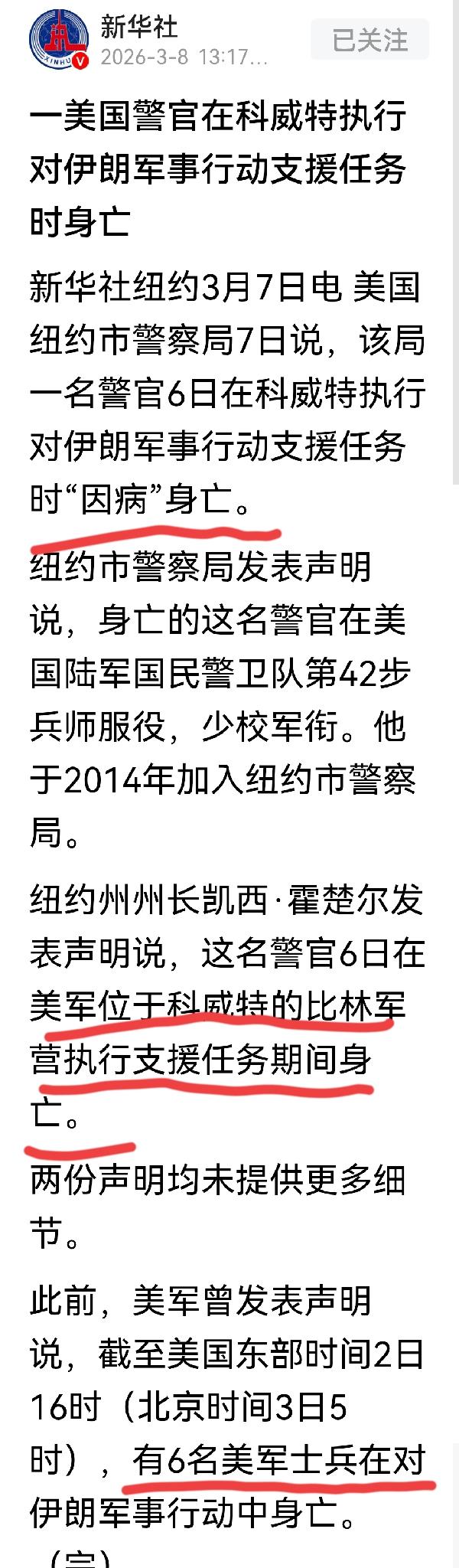 美国死撑面子,瞒报伤亡情况是真实的,一位美军官在科威特伤亡,美两个单位传出了不同的死亡信息很有意思! 7号,来自美国纽约市警察局的消息,该局一名警官在科威特执行对打击伊朗的支援任务时“因病”死亡,纽约警察局还表示这名警官属于陆军国民警卫队第十二步兵师,少校军衔。 而关于这位军官的死亡消息,美纽约州州长的说法却是另一个版本,这位州长的说法是,这位军官是在执行打击伊朗的支援任务时身亡,他的说法其实就是表示遭到了炮弹攻击,被打击身亡。 两种不同的说法,我相信第二种,因为军人的身体应该都是健康的,否则还执行什么军事任务呢?再说若第一种情况属实,美军岂不是一群病猫? 美国瞒报军情损失、有了实锤的证据,不过美军这次瞒报实情可以理解,因为这次美国发动对伊朗的战争,是美国总统个人的意思,没有通过美国国会批准,若伤亡的数据太大,不仅特朗普面子上挂不住,其发动的战争会激起美国内人民的强烈反对,这场战争自然就打不下去了! 现在美军的死亡数字只有6人,这里面的水份不是一般的大。