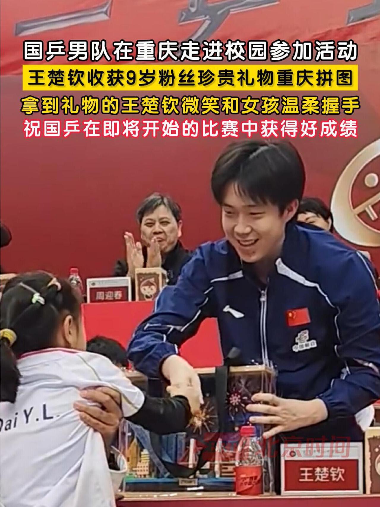 王楚钦大大方方接受9岁孩子的礼物,很慈祥的握手,太有爱了吧! 耶耶坐在台上,太稳重了,高级感这就来了,真的太让人喜欢了,这状态真的很好,很喜欢看楚钦这个状态,越来越温柔,很可爱的大人物! 正能量的人都喜欢王楚钦,本身就很好的人,值得被善待,值得被爱,值得被尊敬!