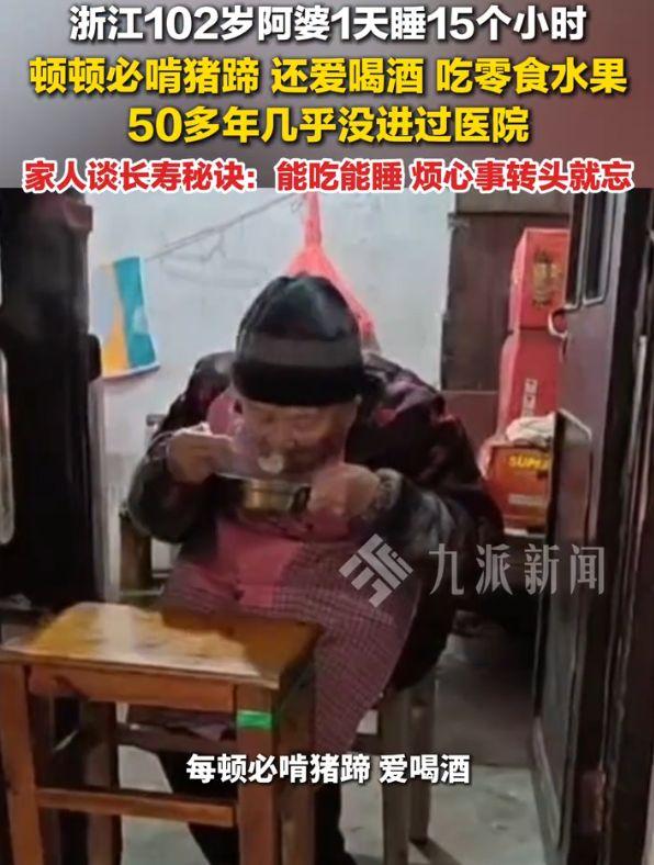 活得通透!浙江台州,一位102岁的阿婆彻底火了,她竟然有接近50年没进过医院,大伙儿都挤破头想打听长寿秘诀,结果家人的回应简单到让人咋舌,能吃加能睡,网友:这境界一般人真学不来。 当天,在台州的一户普通农家里,百岁阿婆正稳稳当当地坐在低矮木凳上,她头戴保暖毛线帽,身上套着件粉红格子罩衣,手里端着个沉甸甸的不锈钢碗,另一只手拿勺子大口往嘴里送饭,动作那叫一个利索。 阿婆的儿子介绍,老太太每天早上9点多才自然醒,洗漱完就去院子里坐着,晒晒太阳发发呆,晚上7点准时上床,中午还得补上一两个小时的午觉,算下来一天能睡够15个小时。 睡醒了就剩一件事,吃。 虽然起得晚,但阿婆的一日三餐顿顿不落,早餐标配是肉包子、肉馅水饺或者馄饨,中午晚上换着花样吃面吃饭,儿媳妇盛满的一大碗饭,她每次都能吃得干干净净。 最硬核的是,老太太是个十足的肉食爱好者,最爱油亮亮的猪脚,每顿必啃两三块,一天能吃下足足半斤,猪肉鱼肉天天见,几乎餐餐不离荤。 老太太这辈子从没跟人红过脸,遇着烦心事转头就忘,家里人都夸她豁达大度,这事传到网上,评论区瞬间炸了锅。 有网友感慨,长寿这东西真的是基因,羡慕不来。 也有人总结,心态好、不记仇、睡眠足,这才是活明白的人,别的小事都不重要。 甚至有网友分享,自家亲戚101岁了还烟酒不离手,长寿的逻辑确实很神奇。 其实仔细算一笔账,这里头挺有意思。 阿婆一天睡15小时,除去睡觉,清醒的时间只有9小时,按102岁算,这辈子清醒活着的总时长大概是335070小时。 可当代年轻人每天就睡5小时,清醒时间有19小时,如果能活到60岁,清醒时长就是416100小时。 这么一对比,就算年轻人只活到60岁,在清醒感知世界的维度上,其实已经比百岁老人“赚”了不少,这大概就是不同的人生算法。 很多人一味追求岁数的长度,却忘了生活质量的密度,与其在焦虑中熬干心血去换一个数字,倒不如像阿婆这样顺应本能,该吃肉吃肉,该发呆发呆。 人活一辈子,清醒的时候每一秒都算数。
