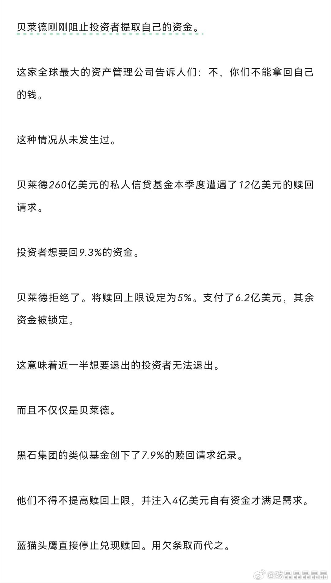 刚才很多金融群传贝莱德阻止投资人提取的资金,黑石也碰到类似情况,不得不提高赎回上限。