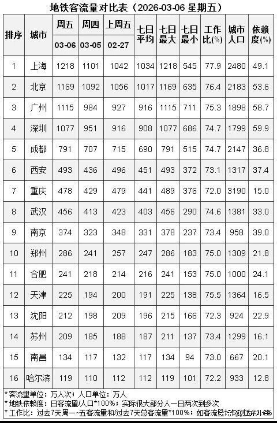 16城市地铁客流量对比。 上海、北京、广州、深圳稳居前四。 成都、西安、重庆西部三霸。 武汉、南京、郑州东中部领头羊。 合肥增速明显,超越天津,沈阳。 苏州差强人意,客流量不如南昌。 哈尔滨位居第16位,不愧为东北大哥。