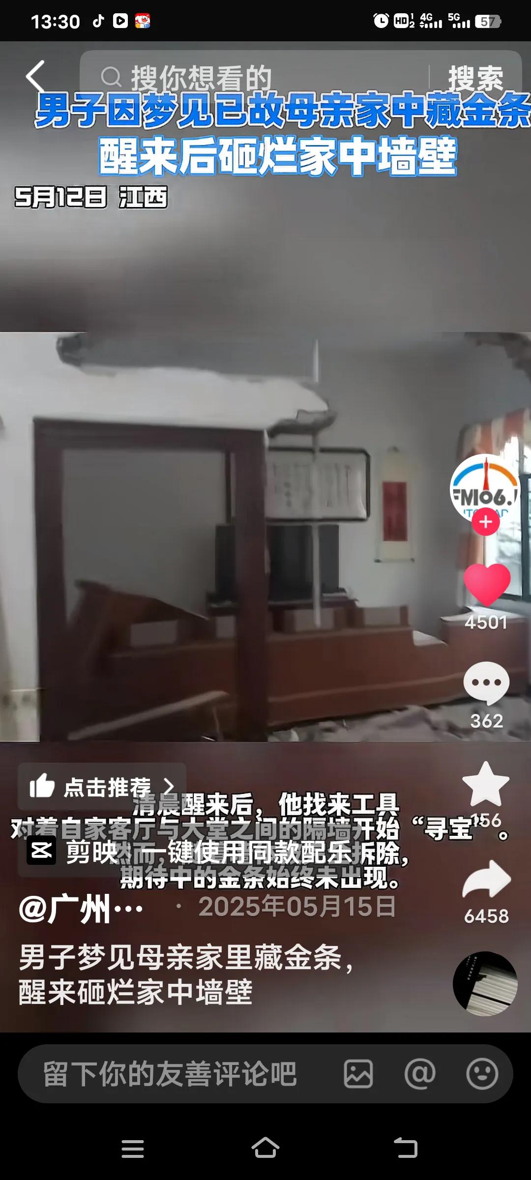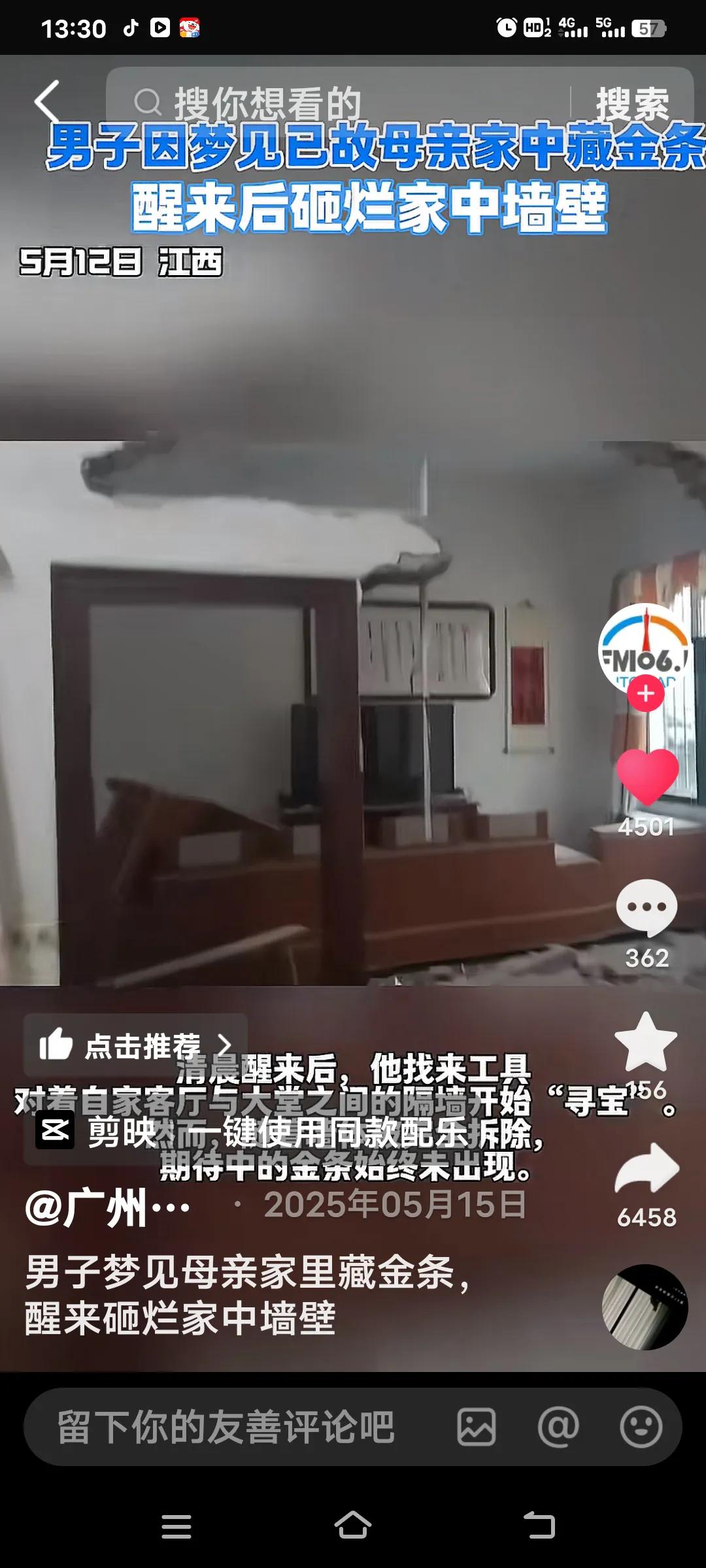 江西这90后男子真是“个狠人”!有天夜里他梦到去世的母亲跟他说家里墙壁藏着金条。 别人做梦可能就一笑而过,他倒好,醒来直接请了一天假,抄起电钻和锤子就砸墙。他先挑母亲爱待的待客室墙下手,家里人咋劝都没用,他还觉得这是发财路。花了2天砸完墙,一块砖一块砖地找,结果啥金条都没见着。 老婆看到墙被砸懵圈了,网友也乐了,调侃他“金条不要命”,还有人说都去做梦找美元。只能说,这梦可不能全当真啊! 想必他也一定很后悔了,说自己就是太信了,一扇墙都没有了。江西砸墙寻金条 江西砸墙男子
