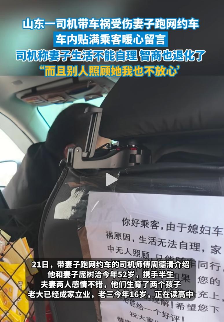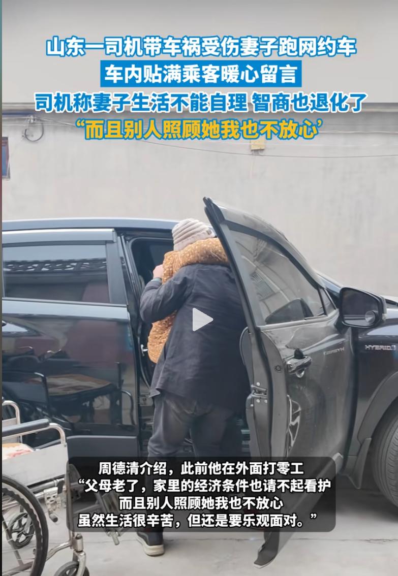 这才是真男人!湖南长沙,一名男子打网约车时发现副驾坐着个女人,原本心里还有点犯嘀咕,可等看清座后贴的那张纸,眼眶子当场就红了,网友直呼:这是全市最安全的车,因为他把全世界都带在身边了。 当天,乘客一上车就瞅见前头挡风玻璃那儿贴着张致歉信,上面密密麻麻写着,因为媳妇儿出了重病,智力退回到了14岁,生活完全不能自理,家里没钱请护工,实在不放心把她一个人扔家里,只能走哪儿带哪儿。 开车的师傅叫周德清,今年52岁了,打从去年媳妇儿接孩子出事后,这个家就彻底塌了一半。 为了给媳妇儿治病,家里前前后后砸进去90多万,可周师傅没想过撒手,每天早上7点准时出车,把媳妇儿安顿在副驾驶,还得时刻盯着她的动静。 只要一停车,周师傅就得赶紧给媳妇儿剥根香蕉、揉揉长期坐着发僵的腿。 他跑车时特意选那些有无障碍厕所的路线开,就为了方便媳妇儿解决三急,一天下来,累得腰酸背痛也就能挣个百十来块钱。 车里头没有半点脏乱,反倒贴满了五颜六色的便利贴,全是乘客留下的暖心话,有人写着加油,还有人手绘了五星好评,甚至有人下车时悄悄多打赏点钱。 这事儿发到网上,评论区全都被这对老夫老妻给整破防了。 有人说,说实话,坐这种车我反倒最放心,因为司机带着最爱的人,开车肯定比谁都稳。 也有女乘客留言感慨,找对象就得找周师傅这样的,这才是顶天立地的纯爷们儿,这辈子能遇上这么一个不离不弃的男人,值了。 大伙儿都在感叹,这哪是跑车啊,这分明是开着避风港在公路上巡航。 看完这对夫妻的故事,心里真是又酸又暖,在这个速食爱情的年代,周师傅用那个移动的小车厢,给大伙儿上了一堂最深刻的爱情课。 这哪是简单的跑车谋生,这分明是两个灵魂在苦难里生死相依,媳妇儿虽然智力退回到了孩子阶段,但在周师傅眼里,她永远是那个需要被护在心尖上的老伴。 结婚时的那句不离不弃,多少人只是随口说说,可周师傅却把它揉进了每一个喂饭、按摩、跑车的细节里,这种感情早就超越了花前月下,变成了长在骨血里的责任。 这个社会不缺有钱人,缺的是这种在废墟里也能紧紧拉住对方手的人。 这种坚韧和善良,不仅照亮了那个小小的车厢,也温暖了每一个路过的乘客。 愿奇迹早日到来,让周大哥的媳妇儿早日康复,愿这份至纯至真的爱情能被岁月温柔以待。