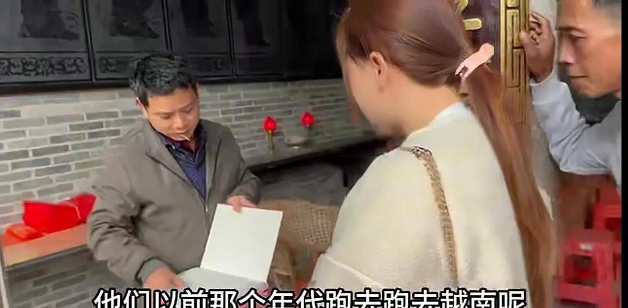 广东刘氏宗祠里,一对小夫妻带着越南岳父翻厚重纸质族谱找丈母娘外公祖籍,族谱管理员