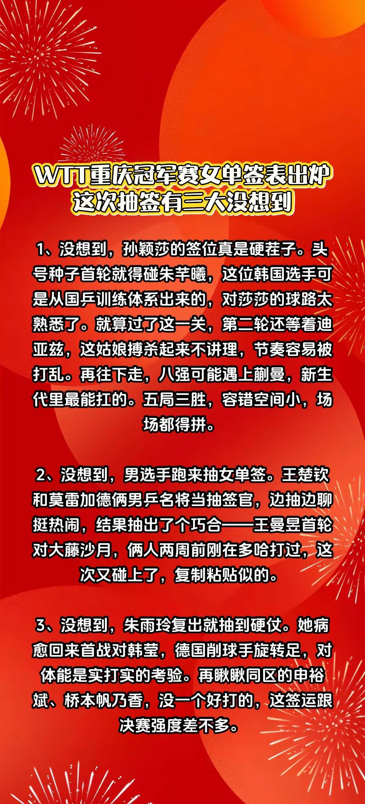 Wtt重庆冠军赛女单签表出炉,3个没想到。国乒