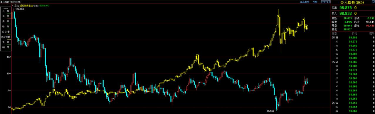 美元与黄金作为全球的避险工具, 两者具有较强的相互替代关系, 从中长期看,两者呈现负相关性。 而且强势美元往往会通过增加 非美买家的购买成本来压制金属价格, 而弱势美元通常会支撑大宗商品市场。 刚刚过去的一周,美元指数止跌回升,再度上调。 当周开盘价97.932,盘中最高99.684, 最低97.769,最终当周收于98.853,涨幅1.26%。