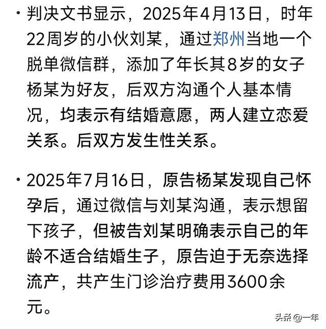 郑州00后拒婚大8岁怀孕女友只赔8500!全网炸锅:青春不是免责金牌,爱情里到底谁在“白嫖”? (来源:综合自法院判决文书及网络公开报道) 当22岁的刘某在郑州脱单群按下“添加好友”时,他或许没想到,这段始于“结婚意愿”的感情,会以法庭上8500元的赔偿金画上句号。年龄相差8岁的恋爱,怀孕后的拒婚,流产手术单上的冰冷数字……这场纠纷撕开的不仅是两个人的伤疤,更是当代年轻人婚恋观里最尖锐的冲突。 一边是30岁女性对婚姻家庭的渴望,一边是00后男生面对责任的仓惶退缩。女方以为遇见了能跨越年龄的真心,男方却坦言“承担不起一个家”。爱情开始时轰轰烈烈,结局却连四万五的赔偿诉求都被法院裁减至零头。感情里的算计,何时竟比青春更廉价? 法院判决书中“同等责任”四个字,像一根刺扎进舆论漩涡。有人愤慨:若连生育代价都能对半分割,情感承诺岂不成了空头支票?也有人冷静分析:法律只管行为后果,难断感情是非。但那份流产门诊记录背后,是一个女性身体与心理的双重崩塌。 翻遍社交平台,类似剧情不断重演。“姐姐型女友”成了某些年轻男孩的情感试炼场,成熟体贴被享用后,责任却被年龄差距轻易搪塞。嘴上说着“未来太远”,行动却是赤裸裸的利己。这不是年龄的错,而是人性里逃避责任的惯性在作祟。 更值得深思的是,当婚姻逐渐从人生必选项变为选择题,情感中的权力天平早已倾斜。强势一方总能找到退路,弱势者却连法律都难讨回尊严。判决书上的数字可以计算,但那些夜里崩溃的哭声、对爱情信任的粉碎,又该由谁补偿? 或许我们都该问问:如果爱情注定伴随风险,成年人是否该在心动前先掂量良心?当“负责”二字被消解成经济补偿,亲密关系是否已沦为一场风险投资?这场官司没有赢家,但它狠狠扯下了某些“青春特权”的遮羞布。 感情从来不是法庭能裁决的事,但人性的底色总会在矛盾中显现。8500元能否抹平一道伤疤尚未可知,可它一定在许多人心里敲响了警钟——爱情可以自由,但永远不能免责。 婚恋观冲突 法律与情感