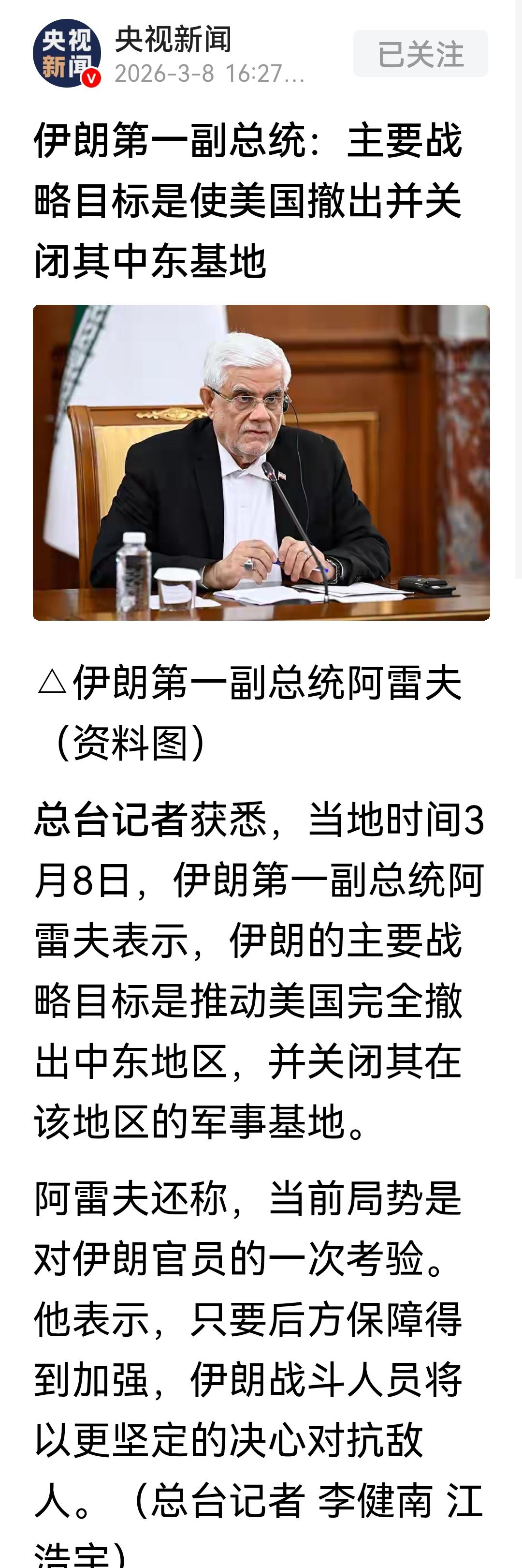 伊朗的副总统比其他文职官员都要强,他的一句话就说在了点子上。 伊朗的副总统阿雷夫表示,伊朗的战略目标就是要将美军驱逐出中东,并关闭美军在中东的军事基地。 大家瞧瞧!这说得多好啊!美军就是中东动荡的乱源,中东没有了美军,以色列就嚣张不起来,中东自然就会平静许多。 相比一些其他伊朗文职官员,针对伊朗打击了中东的美军基地,引起其他中东当事国不满,那些伊朗文职官员竟然向其他中东国家表示道歉,你道什么歉,那些国家向美军提供领土、领空、甚至是领海打击伊朗,等于是同谋,伊朗没有责怪他们,是伊朗宽宏大量,你这一道歉,搞得好像伊朗的反侵略战争变得不对了,这不是颠倒了是非吗?伊朗对邻国的外交政策不是道歉,应该是理解,应该是彼此利益的相互关切! 还有那些文职官员针对特朗普提出的“无条件投降”、其回应也极不妥当,为什么要说“伊朗不会无条件投降呢”,难道特朗普给了优惠的条件,你就心动了,可以投降了?这些人一点水平也没有。 伊朗的副总统阿雷夫倒是一枝独秀,阿雷夫不仅表示要把美军驱逐出中东,面对伊朗现在正在进行的战争,阿雷夫还说,伊朗官员现在正面临着一场大考,伊朗只要后方保障做得到位,就能让战斗人员更好的,更坚定的打击敌人。 伊朗的战士正在战斗,伊朗副总统就看到了文职官员的紧迫任务,他说的大考就是看文职官员称不称职,他提到的后勤保障就是文职官员们的紧迫任务,文职官员们要做好统筹工作,保障战斗人员后方战略物资的源源供应,不仅让他们吃得饱,穿得暖,还要保障生产武器装备所需的一切原材料供应。