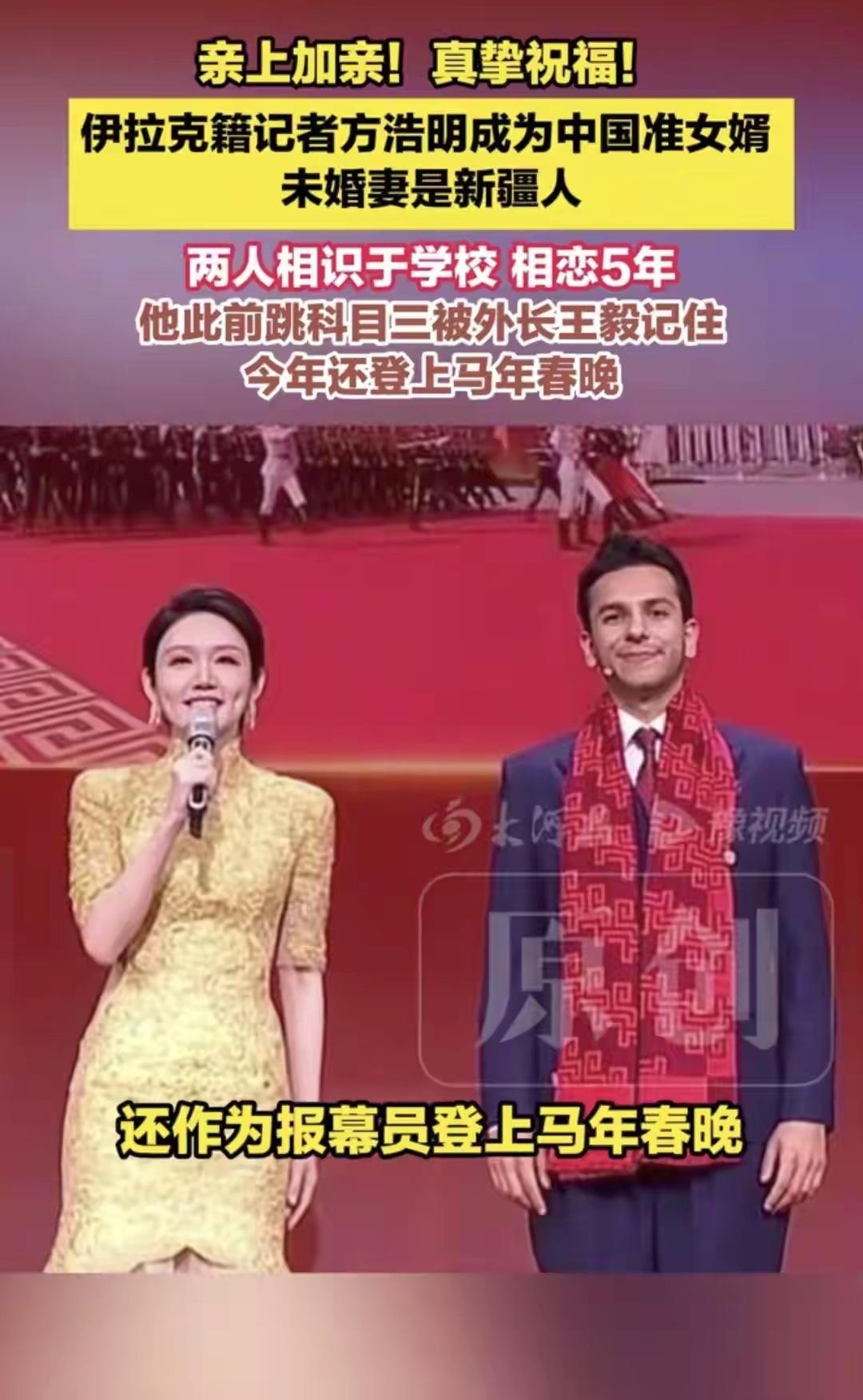 伊拉克籍记者方浩明成为中国准女婿,恭喜🎈🍾️🎈其未婚妻是一位漂亮的新疆姑娘!两人是同学,方浩明对她一见钟情,两人已相恋五年,感情很好,有情人终成眷属。 方浩明,原名为“艾敏”(Ameen),2000年出生于伊拉克巴格达,2011年,方浩明随父母来到中国,曾在宁夏商贸职业学校(原宁夏国际语言学校)学习汉语。方浩明在北方民族大学学习生活了五年,他的中文名字“方浩明”的“方”姓,取自“北方民族大学”校名中的“方”字。 方浩明从北方民族大学毕业,成功应聘到中阿卫视成为了一名记者,常驻北京,主要承担主持人和驻华记者的工作任务。 其父亲曾来中国参加女儿的婚礼,亲眼看到中国的和平和繁荣,马上动员家人搬来中国。他的父母非常开明有远见,把女儿嫁给中国人,迅速撤离飞来中国,让儿子在中国发展,其父母真的很为子女考虑。 浩明已经在中国居住1 5年了,方浩明已经是中国的胃 ,中国的生活方式了 ,就在中国定居!方浩明从小在中国长大,深深地感受到了我们祖国的伟大 他作为记者跑两会,跑博鳌……他用标准的普通话传递中国故事引发关注。 2024年外国驻华记者新年招待会。在招待会现场,方浩明参与表演了节目“科目三”。表演结束后,华春莹与方浩明握手,表扬他“跳得很好”。 他还上2026央视春晚了,方浩明与龙洋一起播报春晚的节目“小家年年”他和龙洋说和平太美好了,一个伊拉克人说出和平太美好啦,他的体会是最深的,愿天下太平! 方浩明是一位正能量满满的优秀记者,他的表哥也是全网两千多万粉丝的“老王在中国”的大网红,都为宣传中国受到了国人的喜爱! 他看九三阅兵当场热泪盈眶,表示羡慕我们的祖国国泰民安。他是伊拉克人, 躲避战乱来到叙利亚,没想到叙利亚也有战争 来中国啦!从饱受战争苦难的国度走来,才更知道和平有多可贵,只有经历过战争的洗礼才知道和平的珍贵,所以方浩明是非常了解这一点的。他也很喜欢我们中国,更羡慕我们祖国的强大才有了人民的安居乐业。 方浩明又帅又聪明,中文说的很好,中国文化博大精深,好好的深耕吧!讲好中国故事,让世界了解真正的中国🇨🇳🇨🇳🇨🇳 伊拉克籍记者方浩明是幸运的,有幸有中国的家人,也让自己在中国成长的过程中感受到和平安稳的幸福生活。 他姐姐好像已经有绿卡了,他又有个中国新疆的女朋友还是要结婚的那种,基本以后就是中国女婿。 方浩明曾表示能跟中国女孩结婚,对他来说是一个很好的选择 他4 岁离开了伊拉克,在中国待了这么多年,而且很多家人亲人也在中国,就目前来说,能跟中国女孩的确是最好的选择。 一个逃亡的难民,逃到中国实现了爱情事业双丰收。 恭喜你成为中国准女婿[鼓掌][鼓掌]成为深化两国友谊的桥梁,祝你俩恩恩爱爱幸福美满白头偕老!