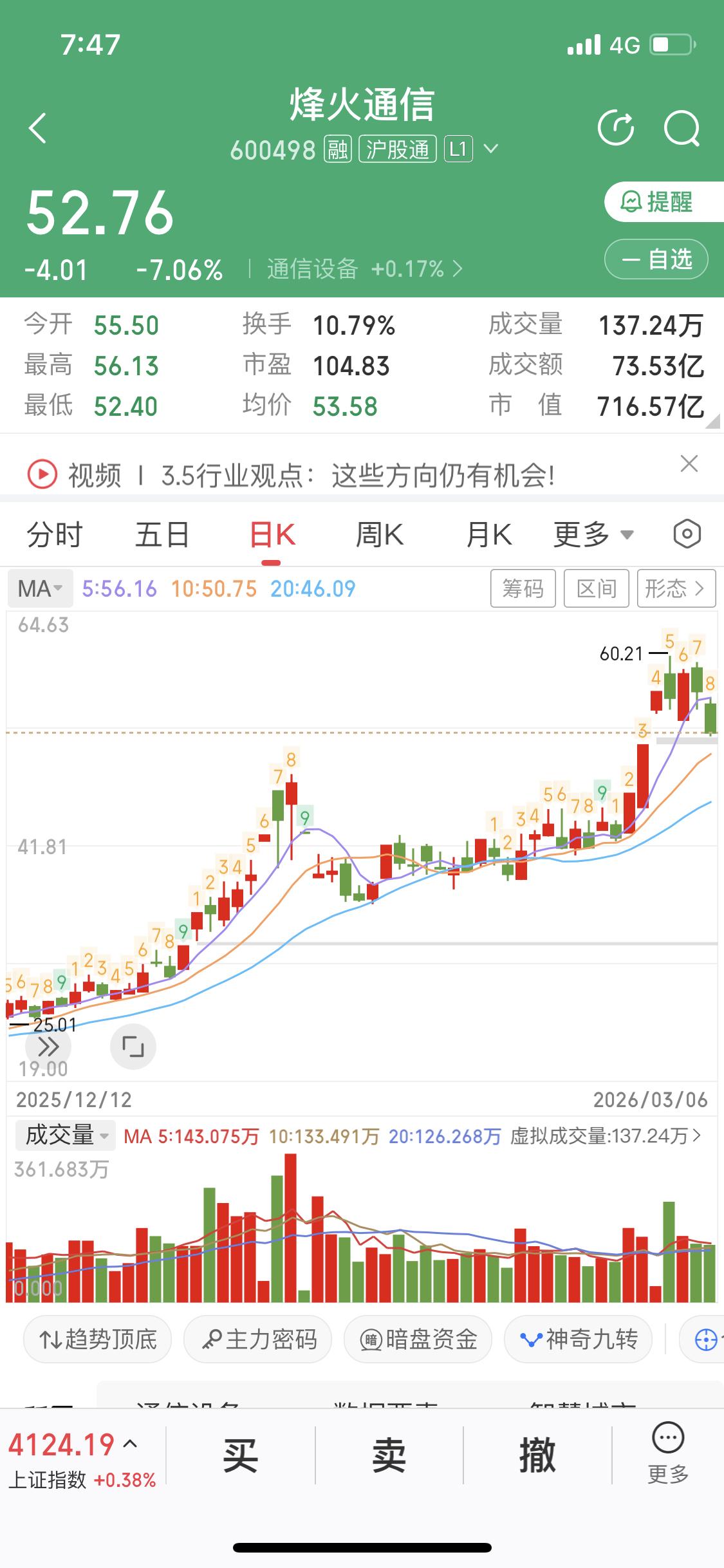 3月8日烽火通信,截至2026年3月2日,它当日上涨10%,现价56.71元,总市值770.22亿元。 作为国内光通信行业核心龙头,它聚焦主业,形成“光通信设备+光模块+数据通信”协同发展格局。产品丰富,像骨干网光传输设备、100G/400G/800G光模块等应有尽有,服务于电信、数据中心等多领域,契合国家战略。 另外,中国移动还携手烽火通信完成50G PON多场景试点。其系统性能出色,上/下行吞吐量高,时延低,能兼容现网终端,降低升级成本,加速万兆光网商用。 明天对烽火通信很关键,如果跌破了支撑、明天考虑清仓它
