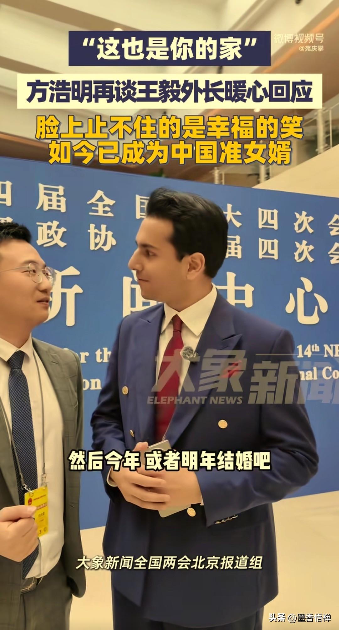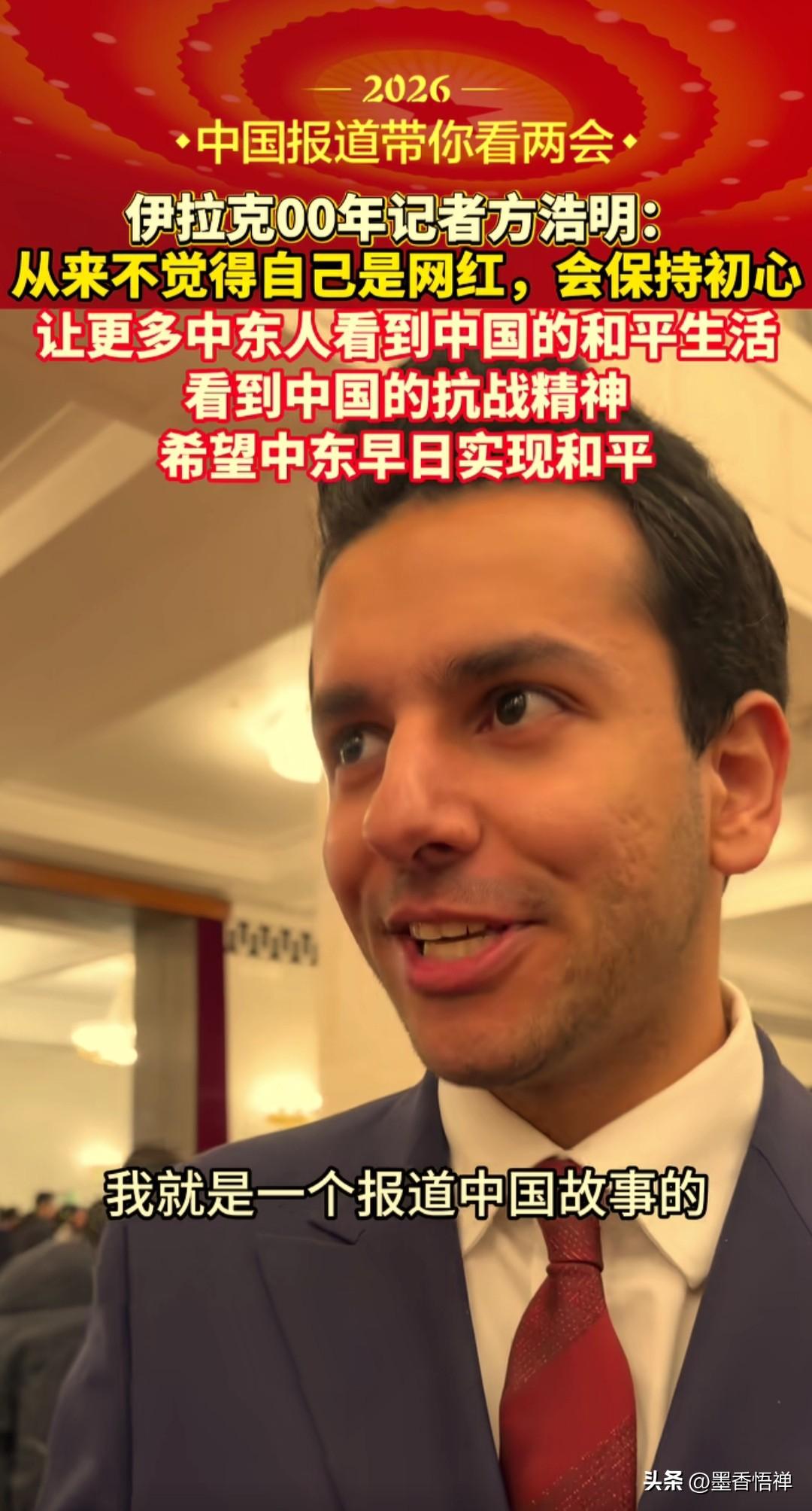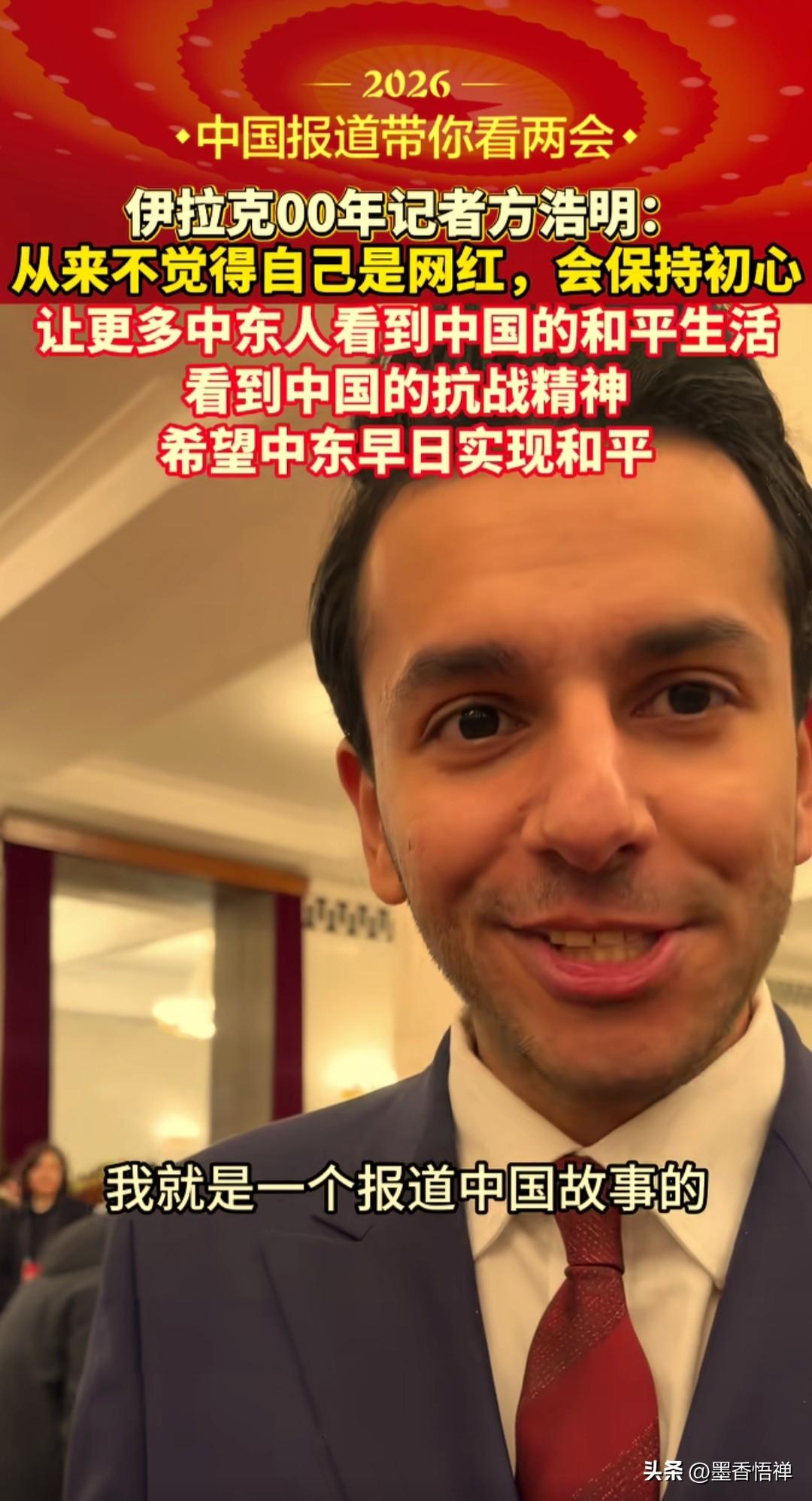 伊拉克“00后”方浩明:从战火中走出的中国“网红”记者,如今成了准女婿 今年全国两会现场,这位操着一口流利中文的伊拉克“00后”再次成为媒体焦点,而更让人惊喜的是,就在3月7日,他刚刚与一位新疆姑娘订婚,正式成为“中国准女婿”。 方浩明,本名艾敏·穆尼尔,2000年出生于伊拉克巴格达。他的童年记忆里,充斥着战机的轰鸣和爆炸的硝烟。3岁那年,伊拉克战争爆发,他家三楼的墙壁上被流弹打穿了弹孔。 为了躲避战乱,全家先是迁往叙利亚,可6年后叙利亚内战又起。“战争就像追着我们一样”,方浩明回忆道。 就在全家走投无路时,一位关键人物出现了,就是他的姐姐。2008年,方浩明的姐姐希琳在叙利亚结识了一名中国留学生,两人相爱并结婚,随后姐姐随丈夫定居中国宁夏。 2011年,当叙利亚战火再次燃起,远在中国的姐夫挺身而出,启动家庭团聚签证申请,为方浩明一家铺就了一条通往安全的道路。 就这样,11岁的方浩明跟随家人来到中国,定居宁夏银川。这片远离战火的土地,成了他“重生的机会”。初到银川,街头的广场舞音乐让他第一次意识到,原来夜晚可以没有爆炸声,原来街上的人可以笑得这么大声。 在银川回民中学,方浩明从零开始学中文。不到三年时间,他不仅普通话流利,还学会了不少本地方言。2017年,他进入北方民族大学学习国际经济与贸易,在校期间多次代表学校参加宁夏高校留学生汉语大赛并获得优异成绩。 “如果没有来到中国,我可能还在战火中漂泊。”方浩明多次感慨,中国用开放包容的胸怀接纳了他,让他从一个在战火中失去家园的孩子,成长为一名自信、专业的媒体人。 为了铭记母校的培育之恩,他特意取“方”为姓,因为“北方民族大学”的“方”字。“那一年我11岁,来到银川以后就爱上了银川,银川人都很友善。”他常这样说。 在方浩明的身边,还有一位同样扎根中国、积极向海外讲好中国故事的亲人,他的表哥王立轩,网名为“老王在中国”。 王立轩同样在中国生活多年,以自己的方式记录着这片土地的点滴变化。他用镜头向海外观众展示真实的中国日常,从街头小吃到城市变迁,从传统文化到现代科技。 表兄弟二人携手发力,用受众易于理解的方式,让更多人看到一个真实、立体、温暖的中国。 方浩明曾表示:“我们非常期待能把中国的机器人和AI技术带到更多国家。” 如今,王立轩活跃在各类新媒体平台上,与方浩明一道,成为中阿文化交流的青年使者。 2024年全国两会的外交主题记者会上,时任外交部长王毅一眼认出了在人群中采访的方浩明,笑着说:“我在短视频看到过你跳‘科目三’,还继续跳吗?” 这一幕迅速登上热搜,方浩明一夜之间从普通记者变成了“网红”。 那一刻,方浩明激动得几乎落泪。他在会后发视频说:“真的非常兴奋,能在两会期间提问部长,心情特别激动。部长也认识我,这辈子值了!” 那段火爆全网的“科目三”舞蹈,其实是方浩明日常记录中国生活的缩影。他喜欢用短视频向阿拉伯世界展示真实的中国:从银川的早市到北京的胡同,从高铁的速度到移动支付的便捷。“很多阿拉伯网友给我留言,说原来中国是这样的,他们想来旅游、学习甚至投资。” 今年两会,方浩明再次活跃在新闻一线。谈及中国科技创新成就时,他用“惊讶”“超出预期”表达感受。 就在3月7日,方浩明左手无名指上那枚闪闪发亮的戒指引起了媒体人的注意。面对追问,他大方举起左手,笑容满面:“订婚了。” 更让人意外的是,未婚妻是新疆姑娘,两人相识于校园,已经相恋整整5年。“我们是在学校认识的,已经在一起5年了,所以现在成了中国女婿了。”他骄傲地补充。 网友们纷纷送上祝福:“一家两代都扎根中国,这才是最动人的双向奔赴啊!”巧合的是,同一天文旅部部长在“部长通道”上提到,“到中国旅游”和“成为中国人”已成国际热词,仿佛是为方浩明的喜讯做了最佳注脚。 谈及未婚妻,方浩明满脸幸福:“她是新疆人,热情、善良。我们在一起,也是中阿文化的结合。”他还透露,未来计划在中国定居,继续用镜头记录这里的故事。 从战火中走出的伊拉克男孩,到活跃在中国两会的“网红”记者,再到幸福的中国准女婿,方浩明的经历本身就是中阿友好交往的生动缩影。他和表哥王立轩一道,用15年的时间,见证了中国的发展,也用自己的方式向世界讲述着中国故事。 方浩明不仅报道中国的成就,更敢于触碰历史的伤痛。2025年9月,电影《731》上映后,他特别组织了一场具有国际意义的观影交流活动,邀请了来自不同国家的人士共同观看。 他表示,希望更多人了解那段历史,不是为了拉仇恨,而是让大家珍惜当下的生活,也让世界看到中国为和平作出的贡献。 “我希望成为一座桥,让阿拉伯世界更了解中国,也让中国更了解阿拉伯。”方浩明说。如今,这座桥不仅连接着两种文化,更连接着两个家庭,以及无数网友的心。