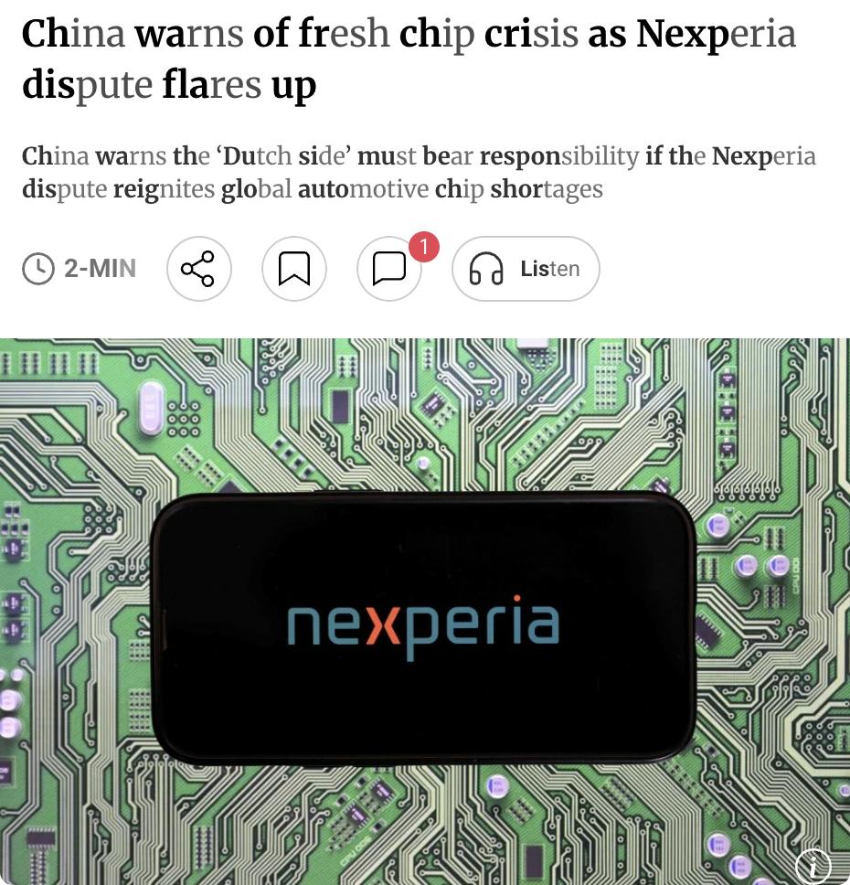 外媒:中荷安世半导体纠纷升级 中国警告称,若荷兰半导体企业安世半导体(Nexperia)与其中国子公司之间的最新纠纷再度引发全球半导体供应链危机,"荷方必须承担全部责任"。 事件起因是Nexperia中国子公司于3月6日在微信公众号发声明,指控荷兰总部自3月3日起大规模停用中国区所有员工的办公账号,导致中国运营严重中断。 Nexperia是全球汽车半导体的关键供应商,此前双方纠纷已曾严重冲击全球汽车芯片供应链。荷兰经济与气候政策部未就此事作出回应。