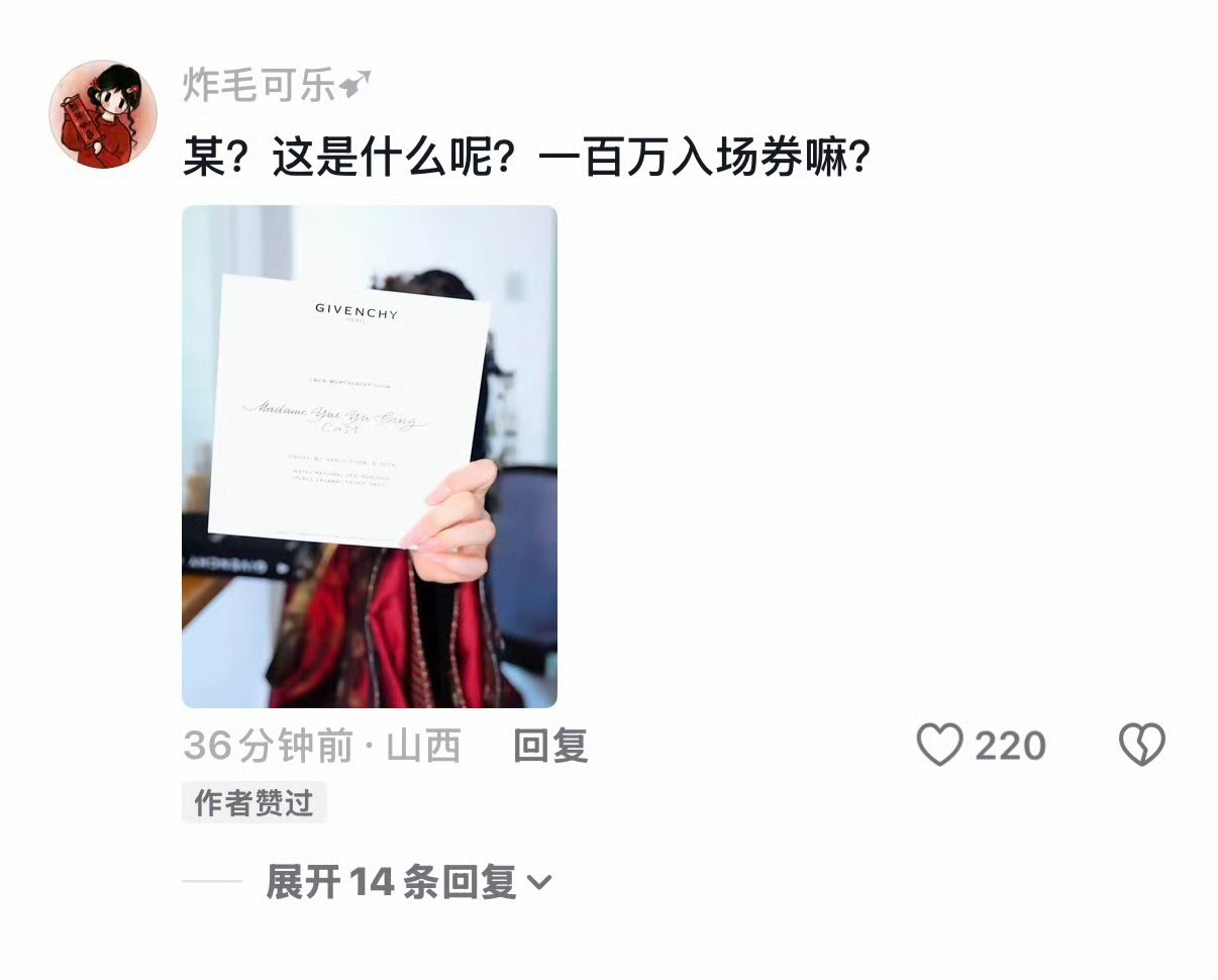 岳雨婷狠狠结算中这一趟知名度打开了,史诗级虐粉达成,微博也红V了,想不出亏了啥 岳雨婷晒纪梵希邀请函