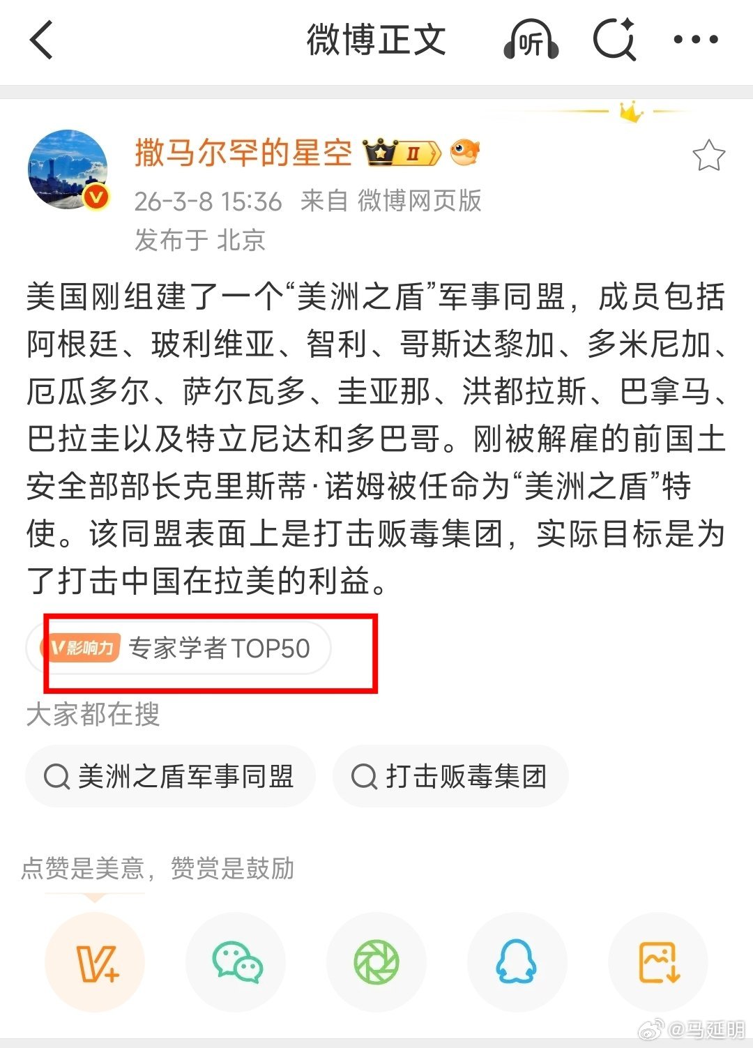 这位名为“撒马尔罕的星空”专家学者称,“美国刚组建了一个“美洲之盾”军事同盟,成员包括阿根廷、玻利维亚、智利、哥斯达黎加、多米尼加、厄瓜多尔、萨尔瓦多、圭亚那、洪都拉斯、巴拿马、巴拉圭以及特立尼达和多巴哥。刚被解雇的前国土安全部部长克里斯蒂·诺姆被任命为“美洲之盾”特使。该同盟表面上是打击贩毒集团,实际目标是为了打击中国在拉美的利益。”