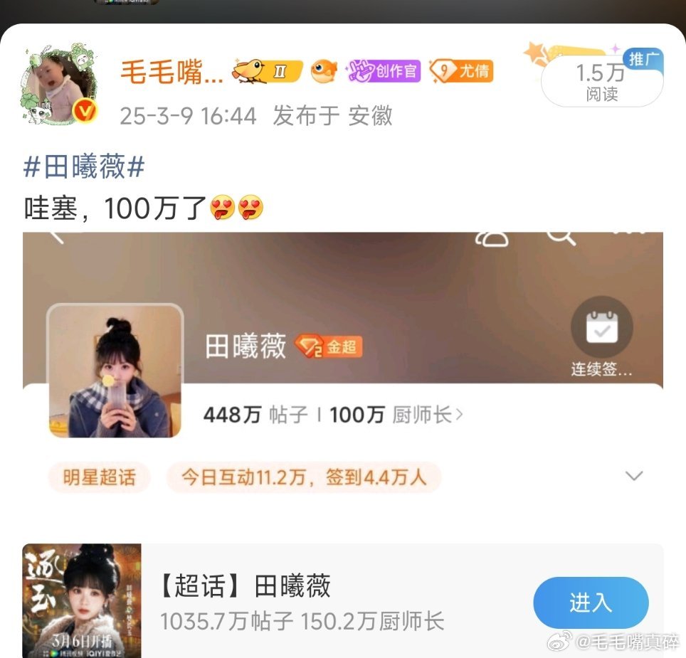 去年的今天田曦薇超话100万,今年150万,但我感觉逐玉会暴风吸粉哈哈哈哈