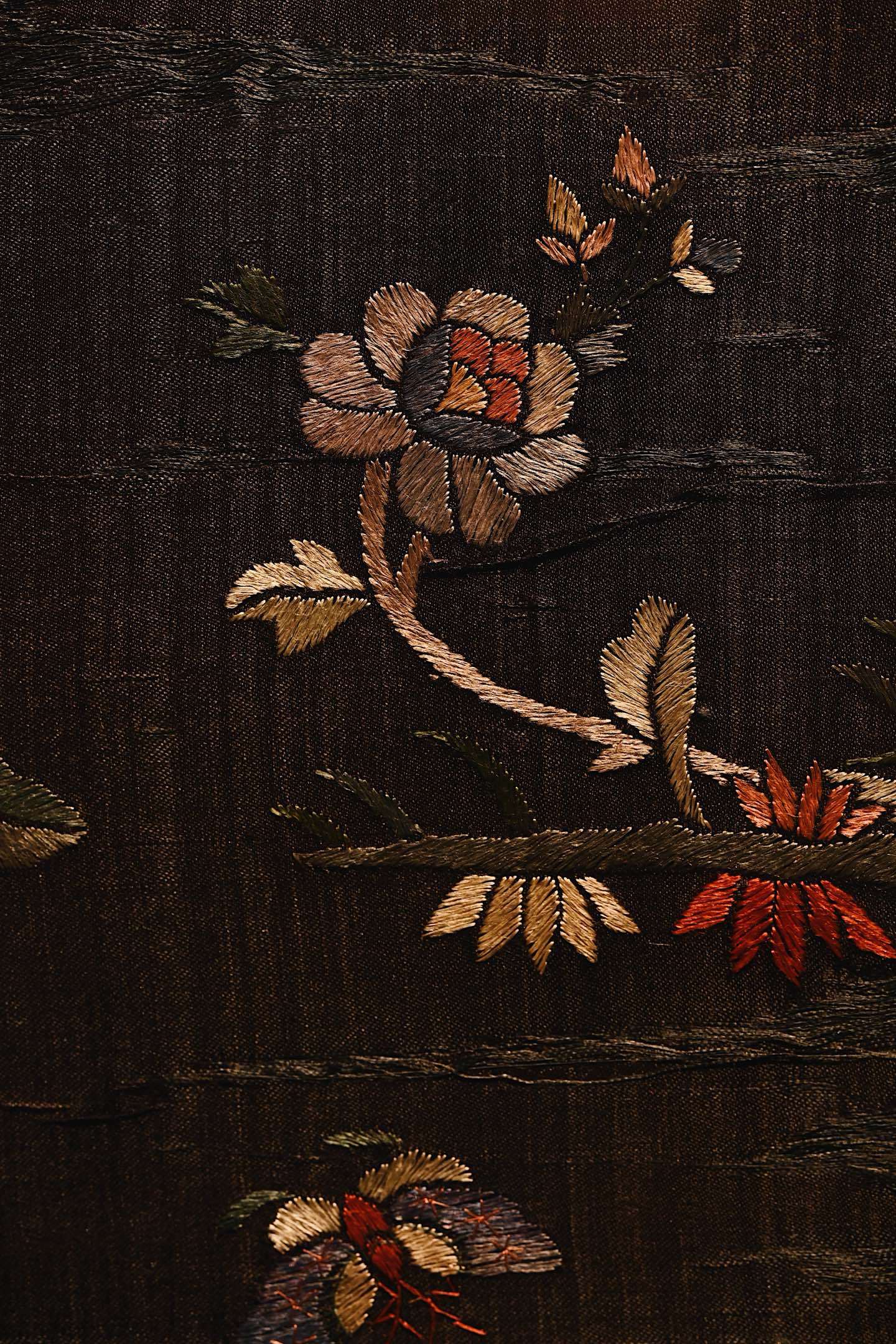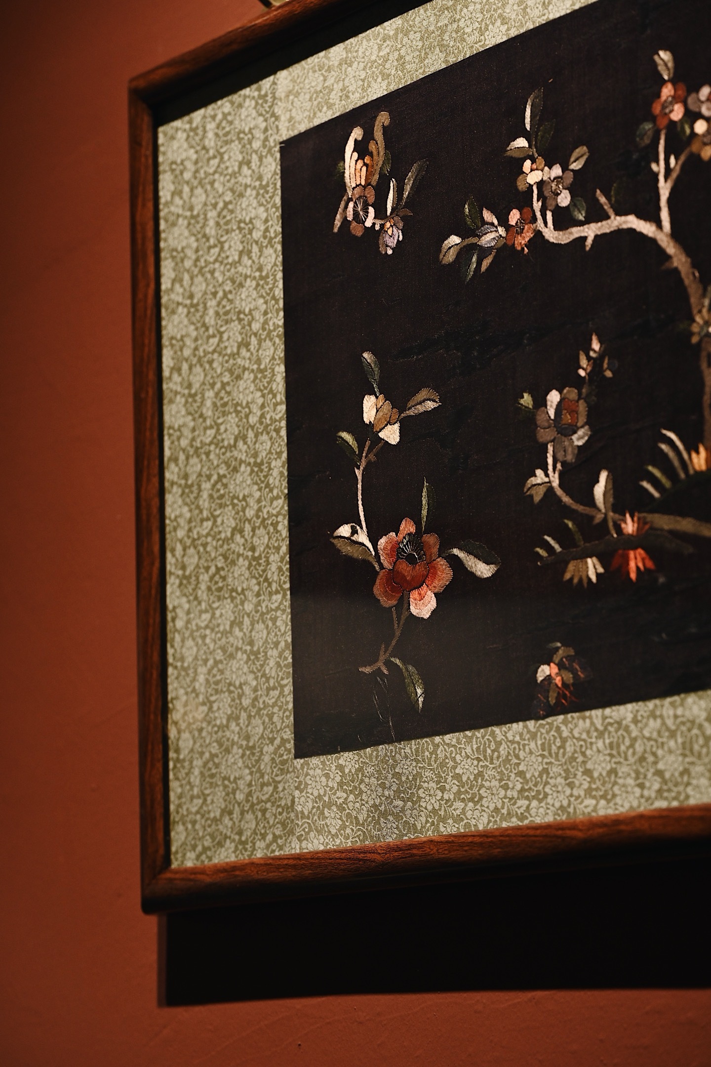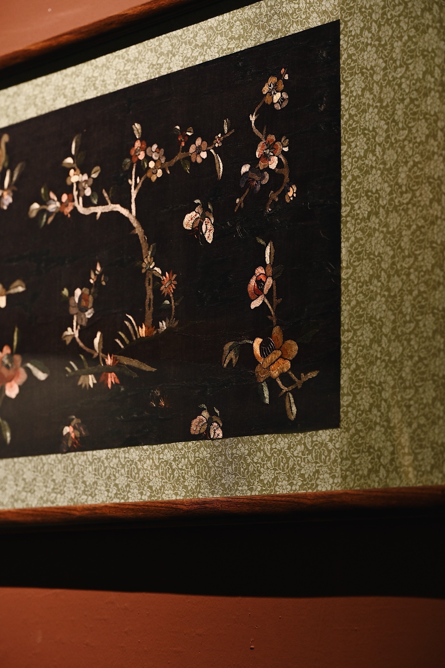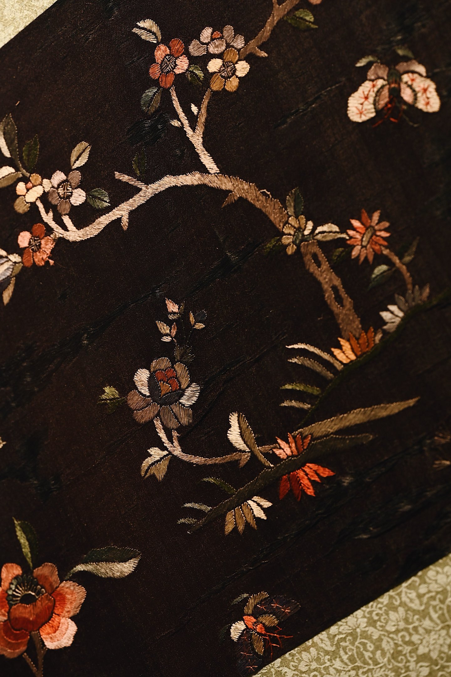 大致为民国之物,保存较为完整,色泽沉穆,取“清供”之意,绣“富贵”之花。画面构图疏朗,红梅迎春,山茶纳福,彩蝶飞舞,饱含吉祥寓意。悬挂于室,承载着东方生活的雅致情怀。